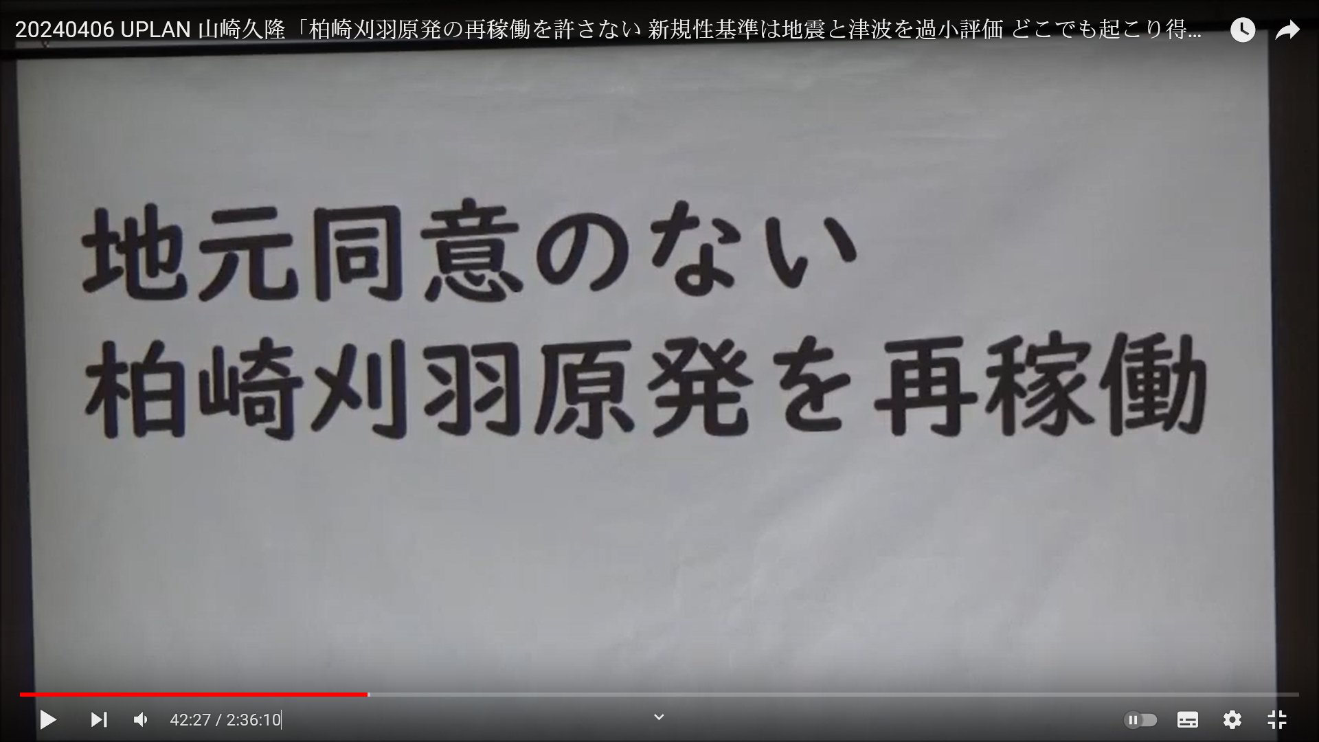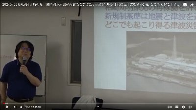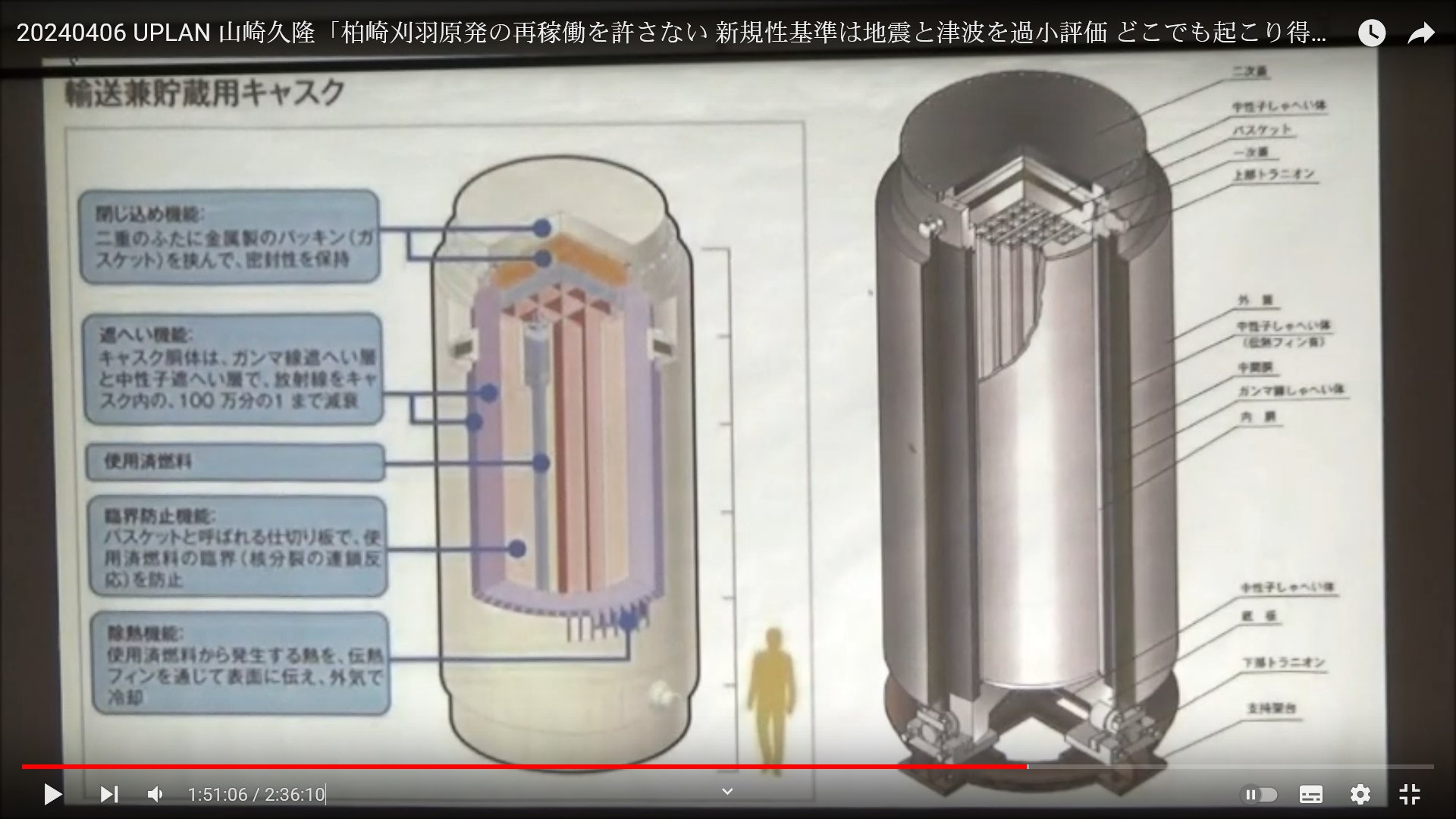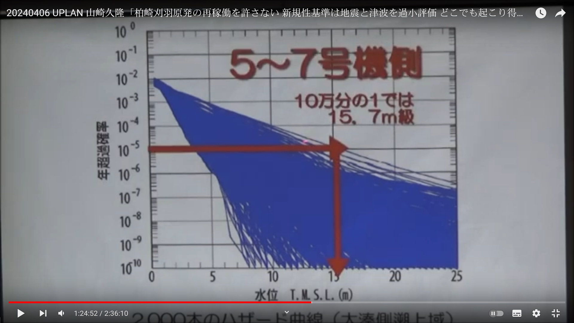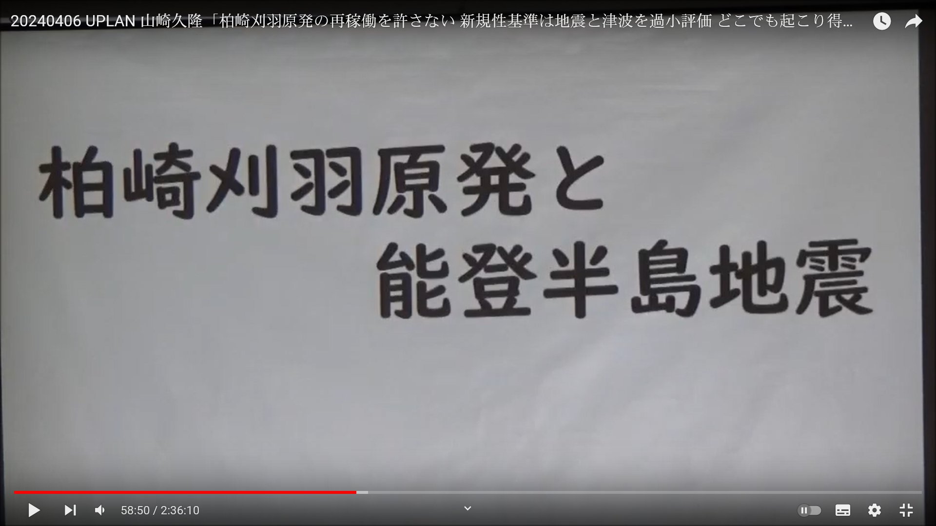 2024年4月6日にたんぽぽ舎において、山崎久隆(たんぽぽ舎共同代表)氏の講演がありました。タイトルは「柏崎刈羽原発の再稼働を許さない 新規制基準は地震と津波を過小評価 どこでも起こり得る津波災害と巨大地震」です。 以下では、 当講演のYoutube動画 に対して、静止画アイコンからビデオへの頭出し、出演者のコメントの文字起こし等の機能を付加しました。見返し等の場合に便利かと思いますので、よろしかったら、ご利用ください。