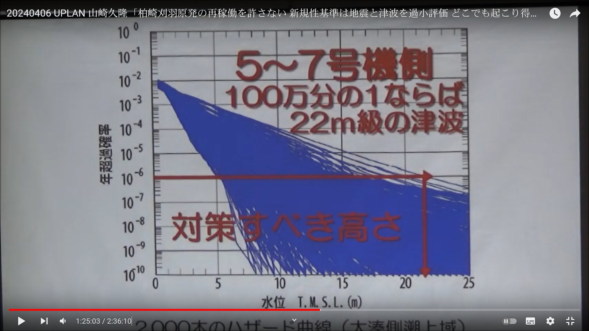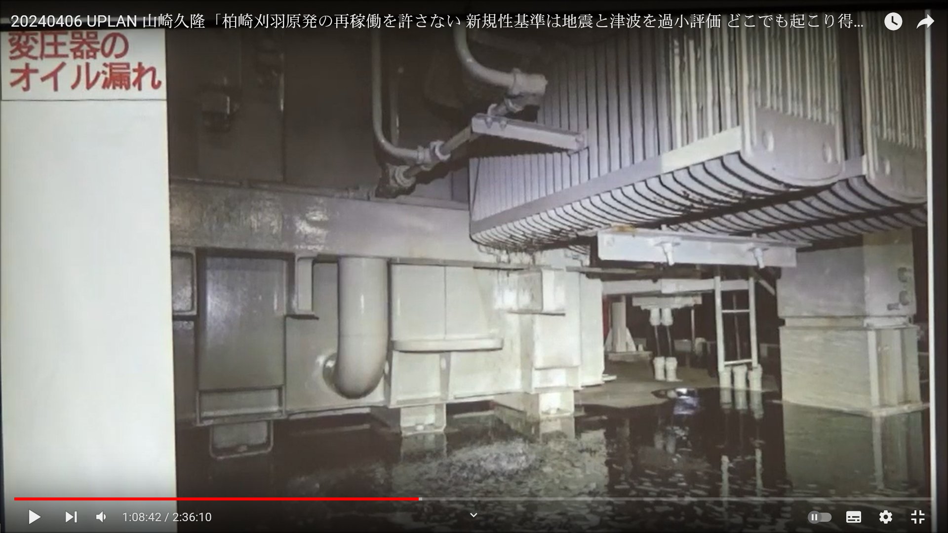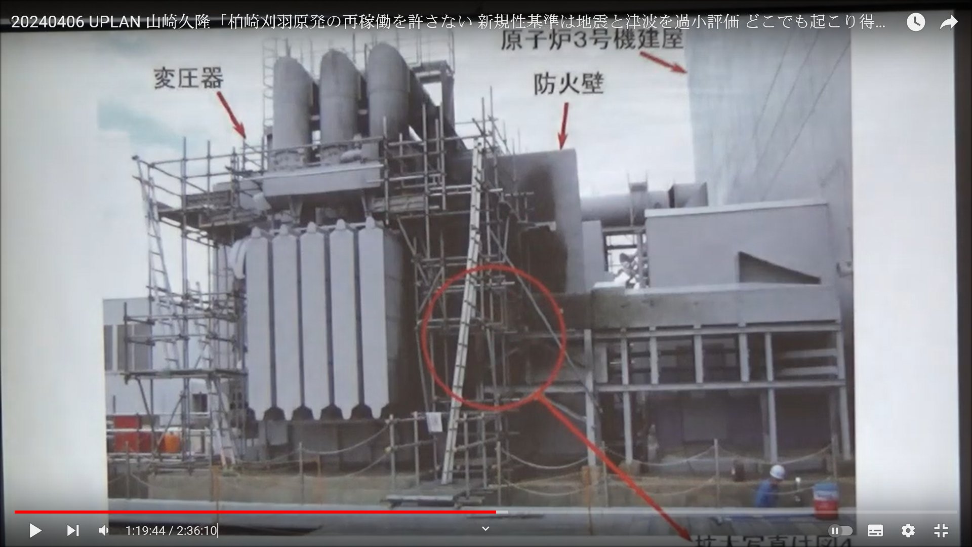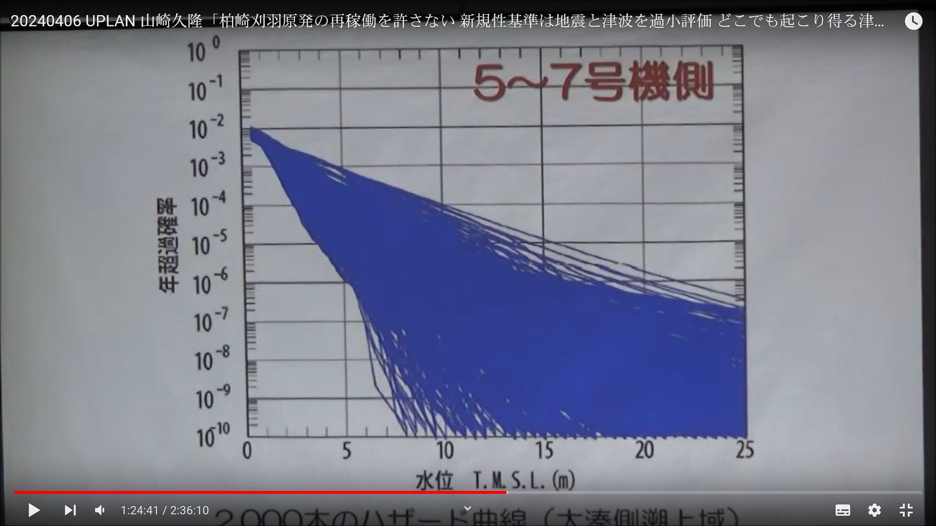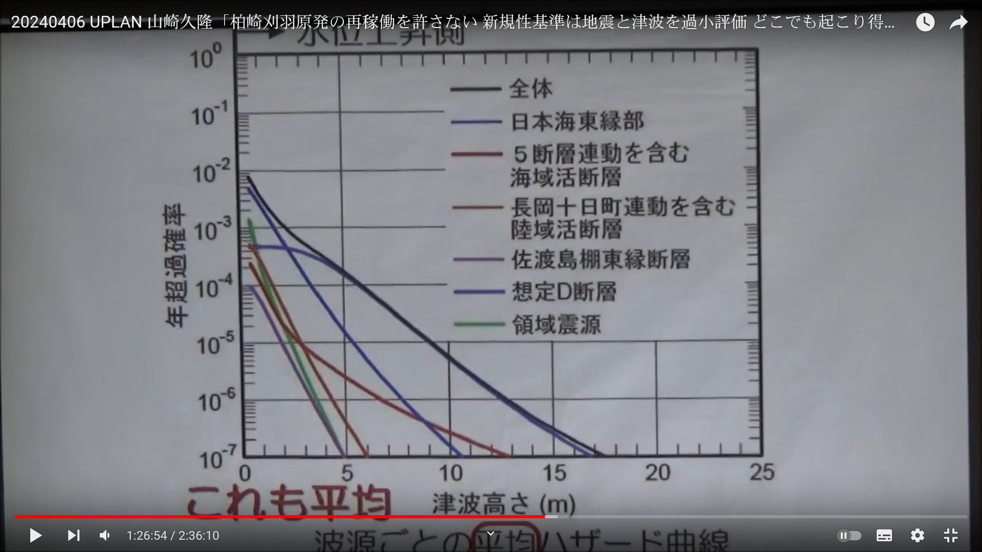 2024年4月6日にたんぽぽ舎において、山崎久隆(たんぽぽ舎共同代表)氏の講演がありました。タイトルは「柏崎刈羽原発の再稼働を許さない 新規制基準は地震と津波を過小評価 どこでも起こり得る津波災害と巨大地震」です。 以下では、 当講演のYoutube動画 に対して、静止画アイコンからビデオへの頭出し、出演者のコメントの文字起こし等の機能を付加しました。見返し等の場合に便利かと思いますので、よろしかったら、ご利用ください。