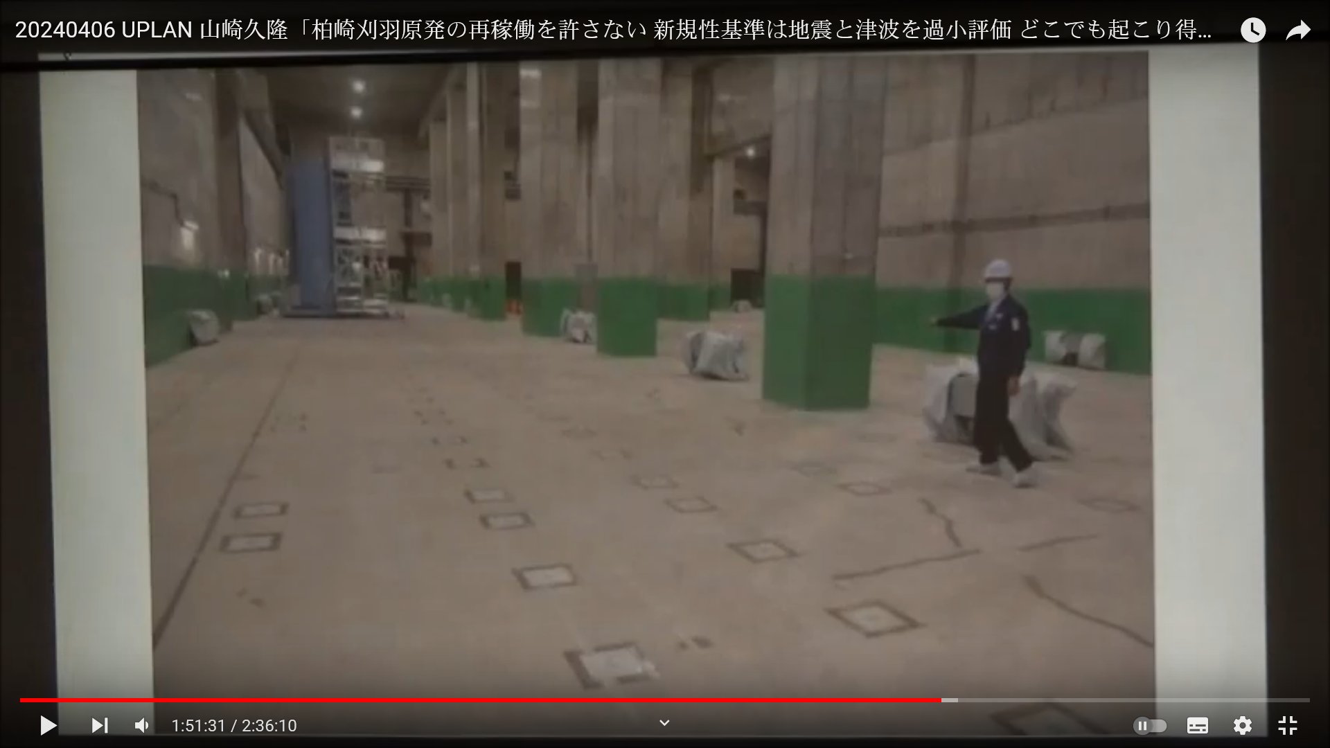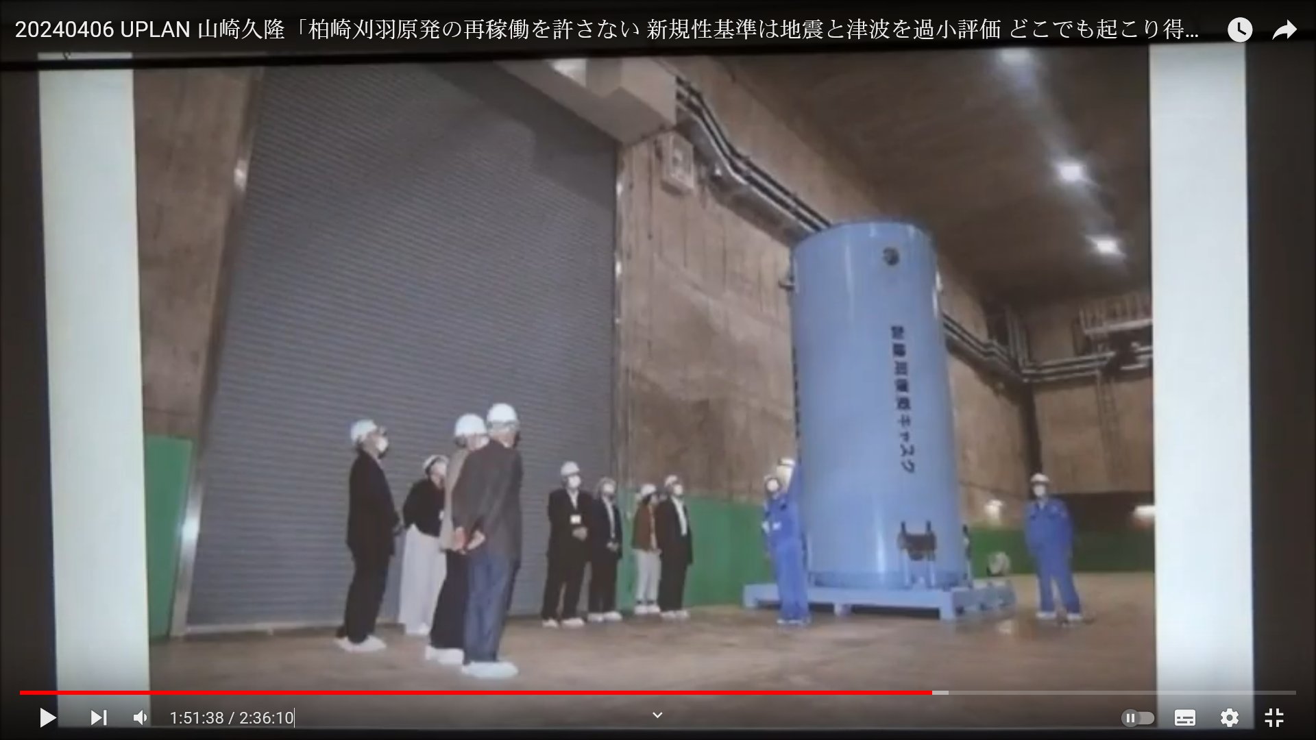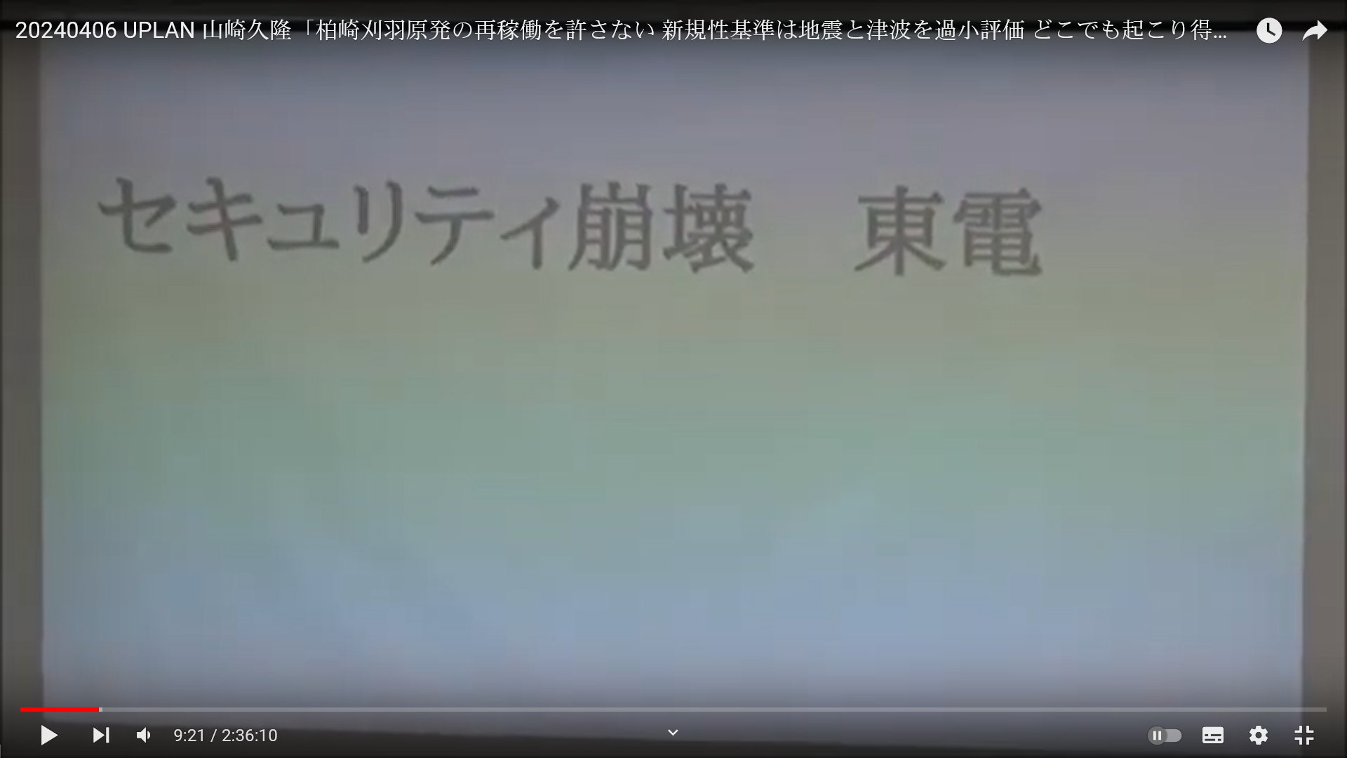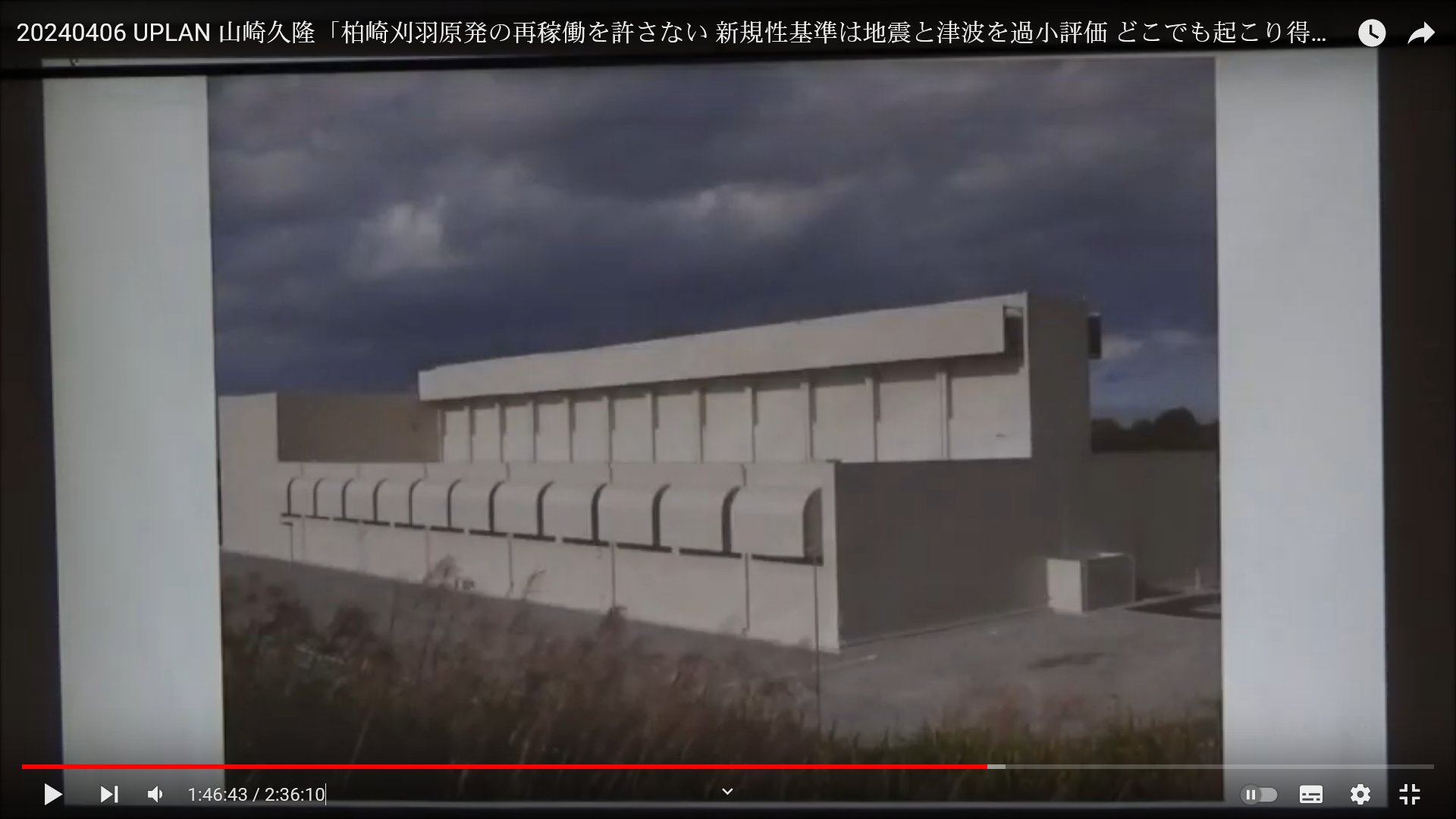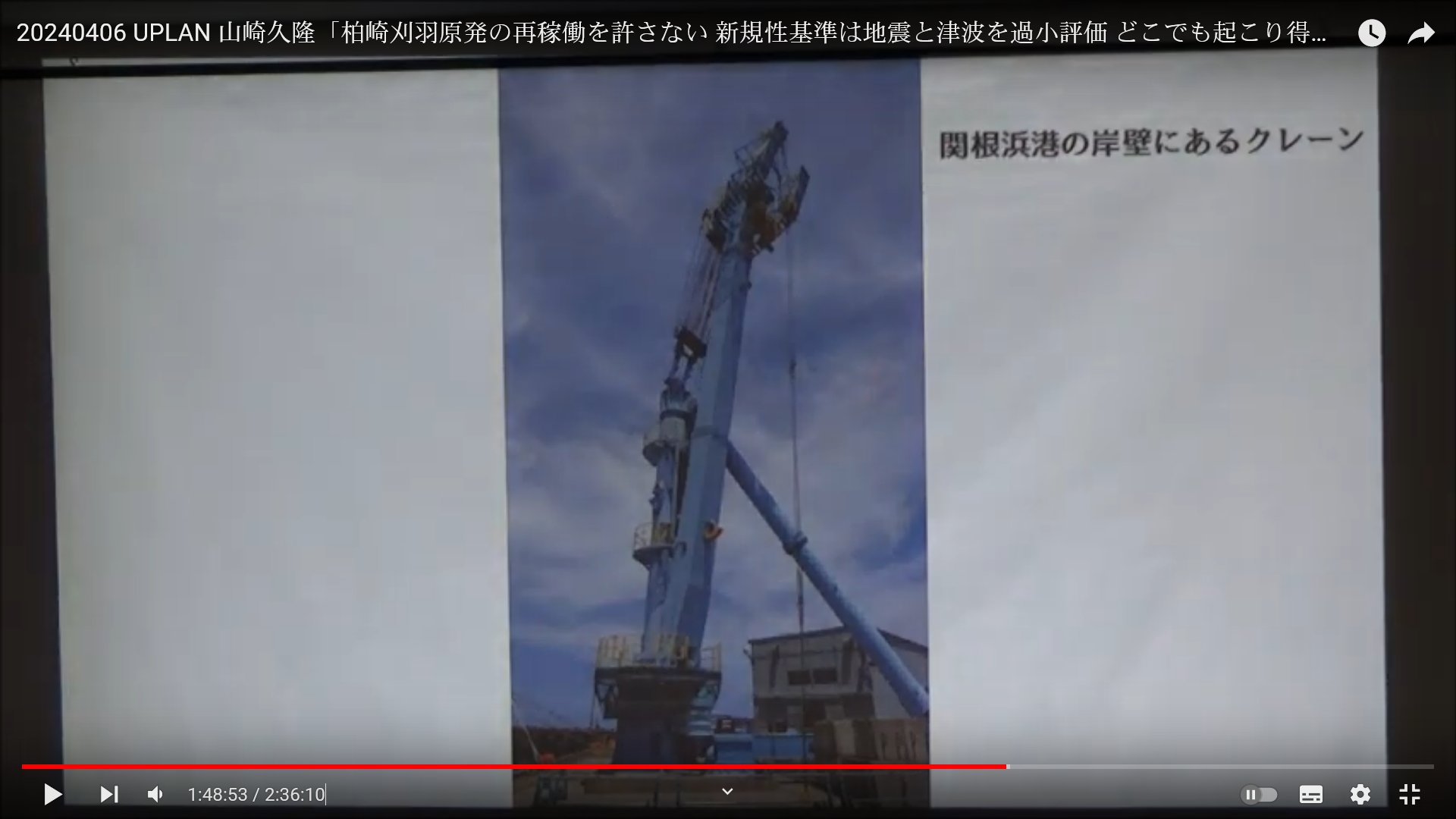 2024年4月6日にたんぽぽ舎において、山崎久隆(たんぽぽ舎共同代表)氏の講演がありました。タイトルは「柏崎刈羽原発の再稼働を許さない 新規制基準は地震と津波を過小評価 どこでも起こり得る津波災害と巨大地震」です。 以下では、 当講演のYoutube動画 に対して、静止画アイコンからビデオへの頭出し、出演者のコメントの文字起こし等の機能を付加しました。見返し等の場合に便利かと思いますので、よろしかったら、ご利用ください。