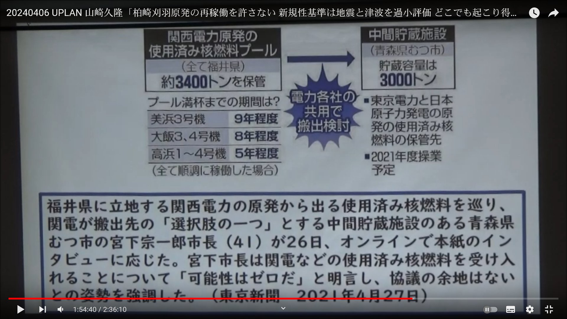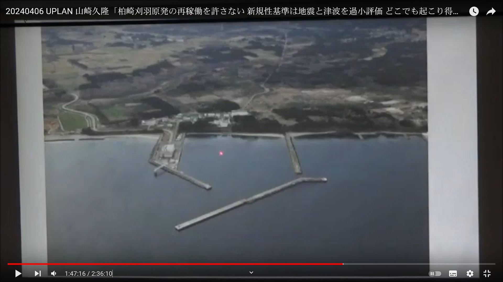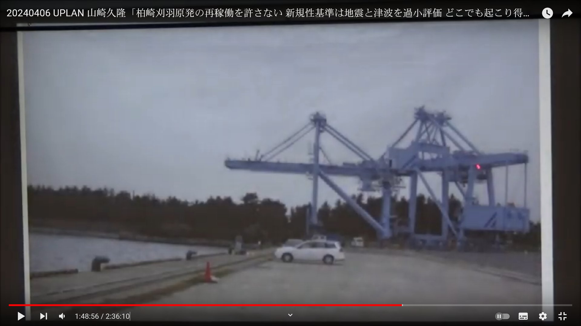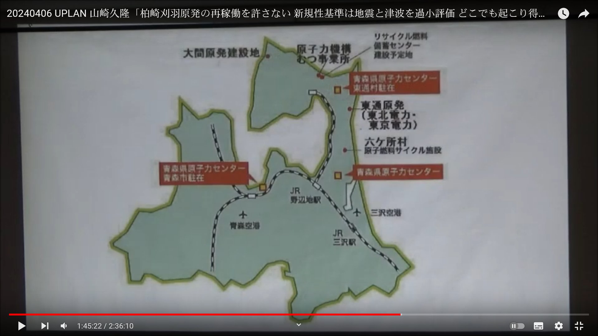 2024年4月6日にたんぽぽ舎において、山崎久隆(たんぽぽ舎共同代表)氏の講演がありました。タイトルは「柏崎刈羽原発の再稼働を許さない 新規制基準は地震と津波を過小評価 どこでも起こり得る津波災害と巨大地震」です。 以下では、 当講演のYoutube動画 に対して、静止画アイコンからビデオへの頭出し、出演者のコメントの文字起こし等の機能を付加しました。見返し等の場合に便利かと思いますので、よろしかったら、ご利用ください。