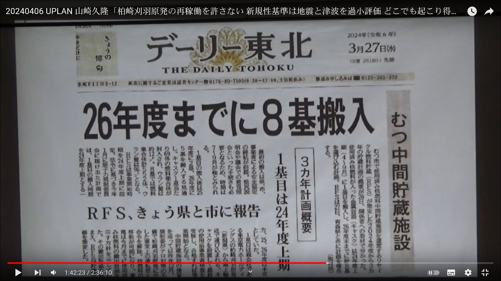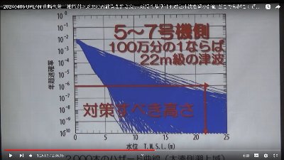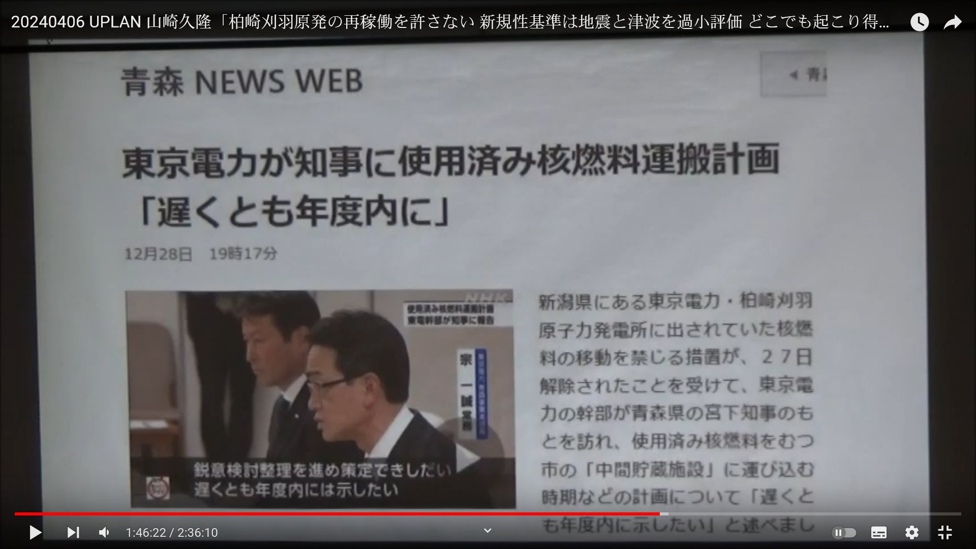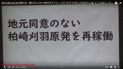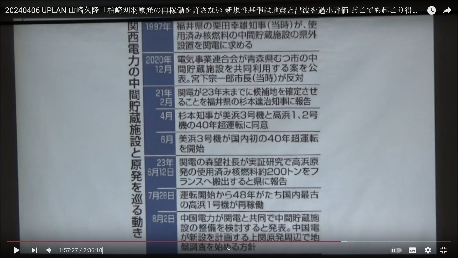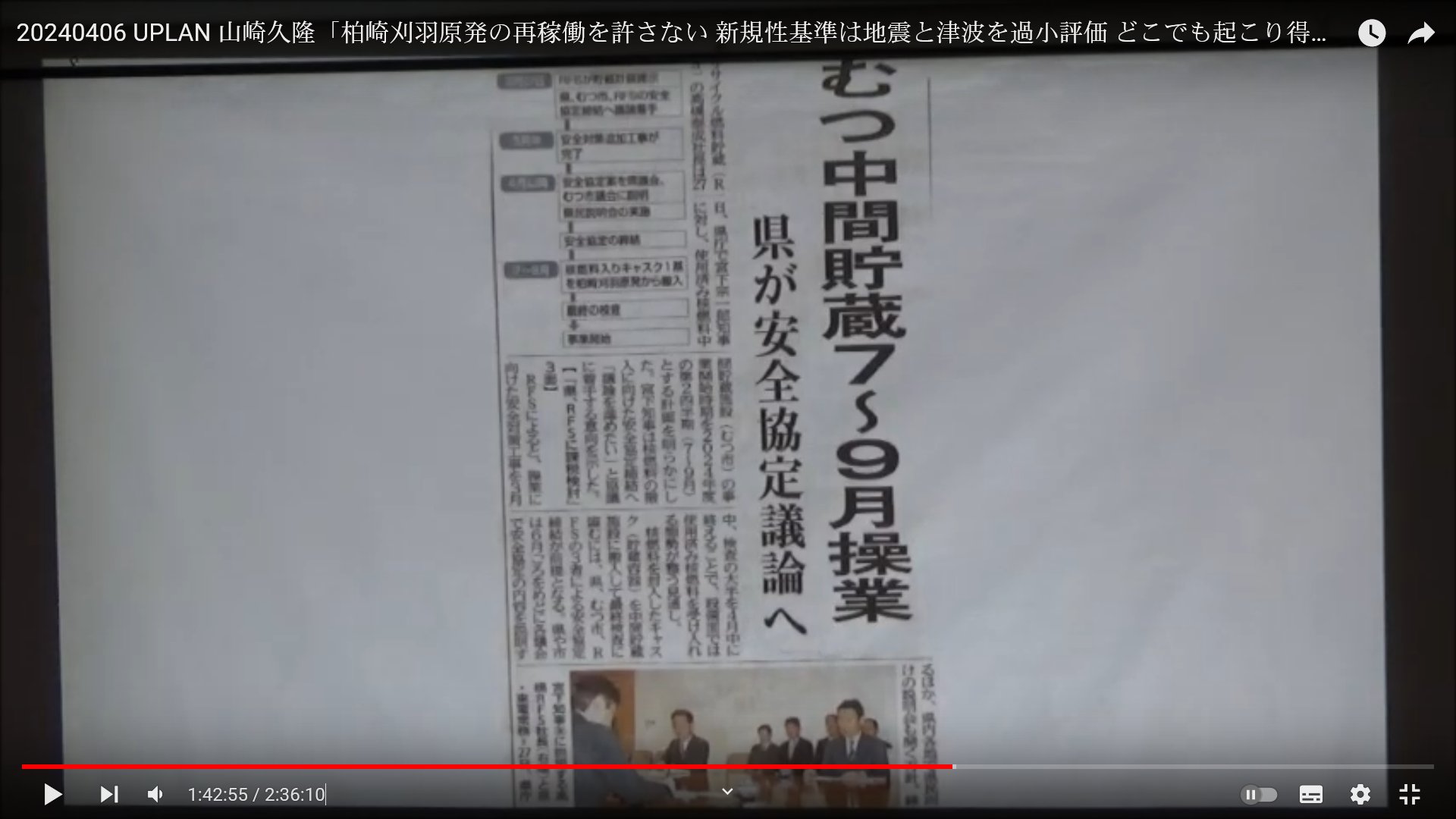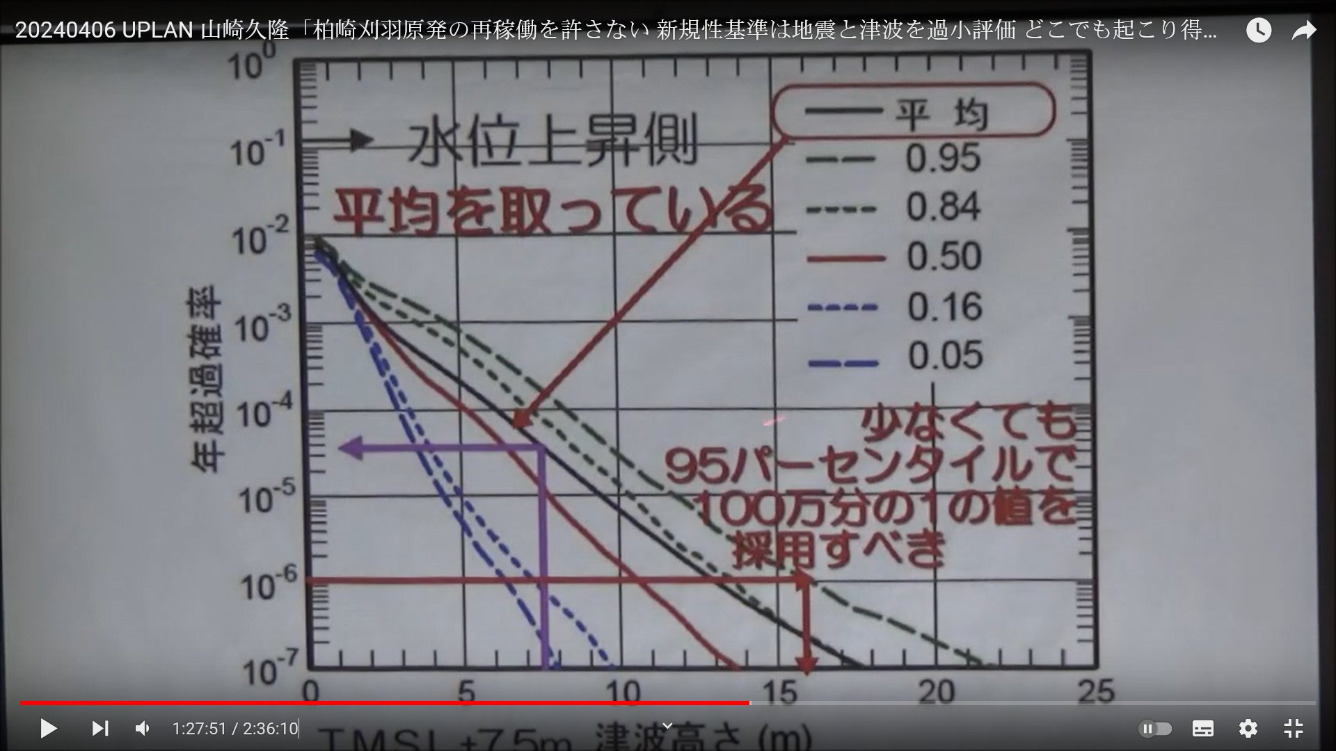 2024年4月6日にたんぽぽ舎において、山崎久隆(たんぽぽ舎共同代表)氏の講演がありました。タイトルは「柏崎刈羽原発の再稼働を許さない 新規制基準は地震と津波を過小評価 どこでも起こり得る津波災害と巨大地震」です。 以下では、 当講演のYoutube動画 に対して、静止画アイコンからビデオへの頭出し、出演者のコメントの文字起こし等の機能を付加しました。見返し等の場合に便利かと思いますので、よろしかったら、ご利用ください。