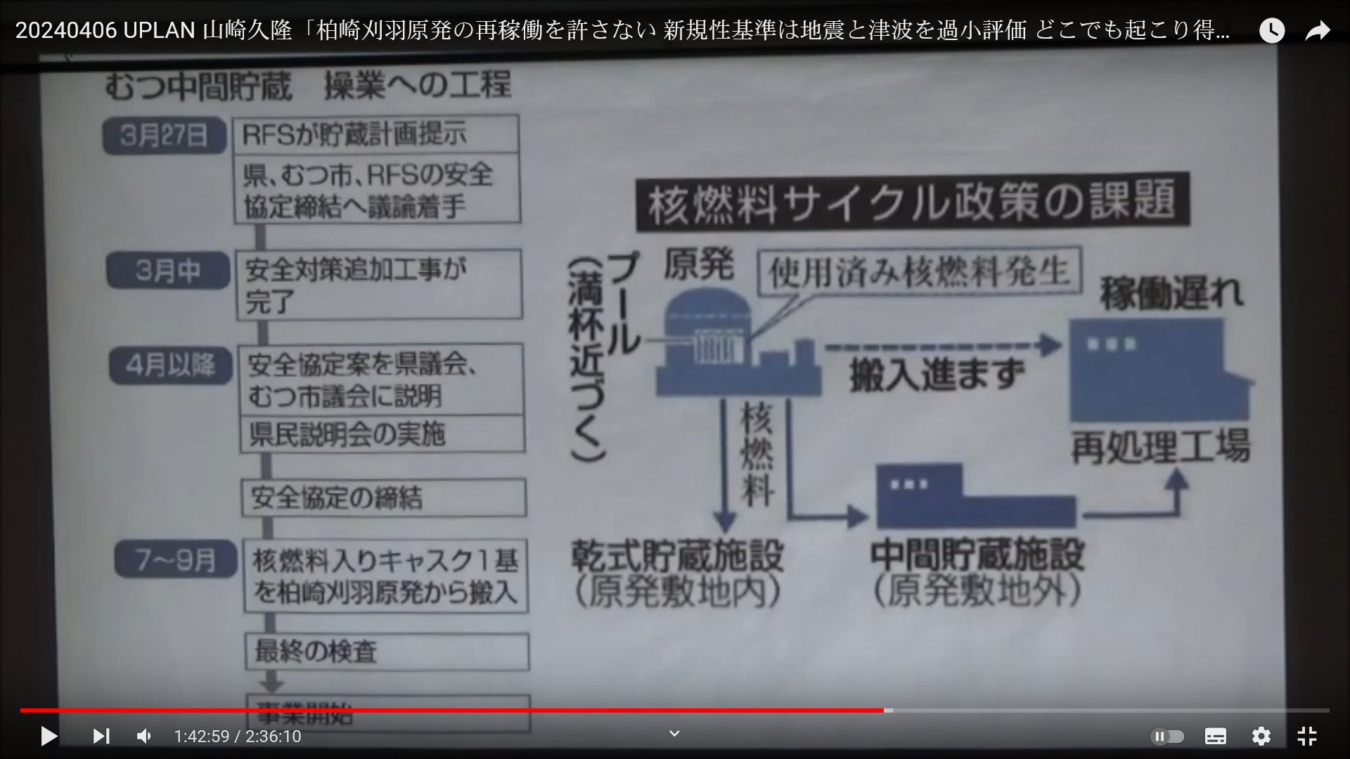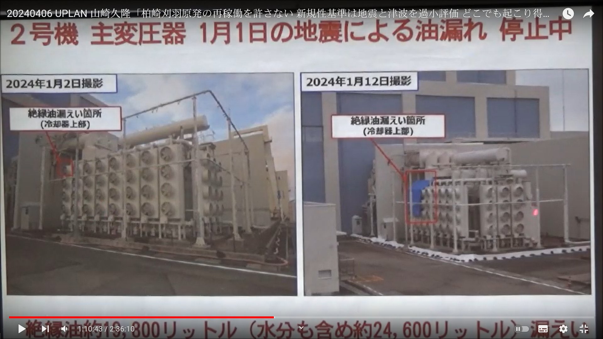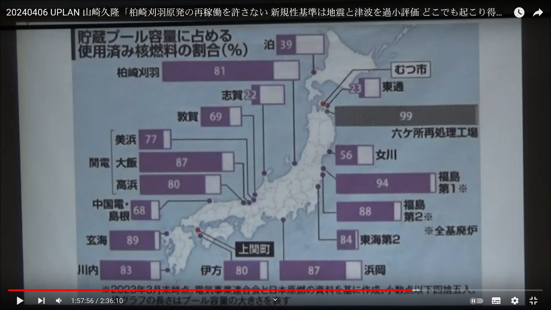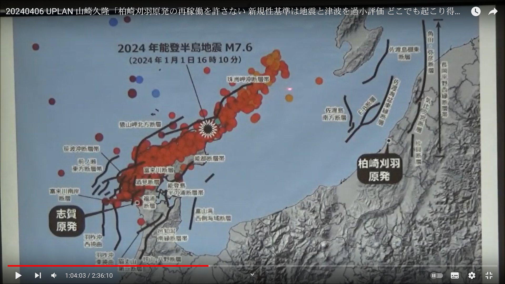 ![]() ○柏崎刈羽原発の再稼働を許さない 新規制基準は地震と津波を過小評価 どこでも起こり得る津波災害と巨大地震 [ 動画先頭:0:01:23〜 ] 今日は柏崎刈羽原発を中心にして問題点を明らかにしたいと思います。 といいますのは、柏崎刈羽原発の再稼働に向けた事前準備ということで、二つのことがこれから行われようとしています。それが非常に大きな問題を抱えているということを中心です。 その第一番目としては、再稼働のために7号機に燃料体を装荷する。これから画策をしようとしている。時系列にいうとこれが一番早い。 それから、使用済み燃料の輸送を行います。青森県のむつ市のRFS(リサイクル燃料貯蔵)という会社の貯蔵施設に送る作業を行います。 その間に挟まって、だろうと思われれる、日にちがあきらかでないこととして、ー燃料プールの輸送、 号機間輸送 と呼んでいるんですけれど。例えば4号機の燃料プールが空いたから、そこに7号機から移すみたいな。そんなことをいつ日程かわかりませんが、やろうとしているであろう。そういう作業もあると考えられています。 それらを含めまして柏崎刈羽原発の現状を説明する。そのあと、柏崎刈羽原発は能登半島地震によって新たな問題があることが浮き彫りになりました。 そのことも、その次に説明します。まあ、私たちは柏崎刈羽原発どんな理由があろうと反対なので、あまり何が起きたから、反対が変わるなんてことはありませんから、影響がないといやないんですけれど、ずっと反対なんだから。 けれども世の中的には、かなり大きな影響でして、柏崎刈羽原発が動き出して、地震や津波に遭遇した場合のリスクというのが、今まで考えられていたよりも、かなり大きい。 さらに東電の柏崎刈羽原発の想定自体はかなり怪しい。ということが本来ならばこの能登半島地震によって浮き彫りされたのですから、そのことをもって、ま、言ってみりゃ、審査のやり直しと言いますか、想定のやり直しといいますか、そういったようなことも含めて、やっていくべきこと、そういうレベルのことなんだと私は思っていますけども。 そういう動きはもちろん全くなく、規制委員会は柏崎刈羽原発に問題があるとは露ほど思って思っておらず。さらにIAEAまでやってきて、お墨付きを与えようとしている。はっきり言って、IAEAの人たちは、原発はプロかもしれませんが、地震は素人ですから、津波ももちろんド素人ですから、あの彼らの出身国で、地震や津波に遭遇して大変な目に遭ったなんてことは、ほぼない人たちなんですよね。ヨーロッパが中心なんで。アルゼンチンのウノシー事務局長ただ知らないしチリじゃないですからね。チリの出身だったらちょっと違うかもしれない。 そういうことで、結局自分たちの知見の外側にある地震と津波によって原発がとんでもないことになるよということをあまり理解していない人たちが、IAEAでやってきて、何を見ていったかというと、結局、セキュリティ上の問題点、IDカードがどうしたとか、監視カメラが壊れたとか、そういったレベルのことがちゃんとまともに直ってますかっていうそういう議論をしに来ただけなんですね。 自然災害に遭遇してどうなるかなんてことは、まあもちろん知見がないのでわかりません、誰か記者が聞いてくれればいいのですけれども。誰も聞いてくれないんで、そういうニュースにならなくて悲しいんですけど。 そういうことをしに来たわけでは全くないのに、当然のことながら、国はこのIAEAのそのうち出るであろう報告書で、お墨付けをもらったと、またやるわけですね。 汚染水の絡みで、IAEAに対して、なんか見てくれと、チェックしてくれと言って、結果的には政府が作った日本政府が作った放出のプロセスと、それから東京電力が書いた申請書、それらを読んで、それらがいわゆる国の規制だけではなくて、国際規制基準の中に合致しているかどうかという話をしたわけなんですね。要は、そのプロセスが唯一のものなのか、もっと別にいい方法がないのかとか。 あるいは放出した放射性物質が想定外のものが含まれていた場合どうなるのか、とかそういったことは一切念頭にありませんので、そういったことが念頭にない上で、IAEAがあの福島第一の汚染水の放出について評価すれば、国の評価の追認するしかないのは当たり前であります。 例えば私たちが大学の入試の試験問題を借りてきてですね。誰それさん合格したらしいんですけど、これ合ってますか?って言われてね。そりゃあってるでしょうよというしかない。どこが間違ってるんだって知見があるわけじゃないそういうレベルなんですIAEAは。彼らが一番必死になっているのは、福島第一原発事故によって世界中の原子力発電所の建設計画が全部一斉にストップした。例外は中国とロシアです。それ以外の国は全部ストップした。 それを再度復活させるのに十年以上かかった。というところで、二度とこんな事