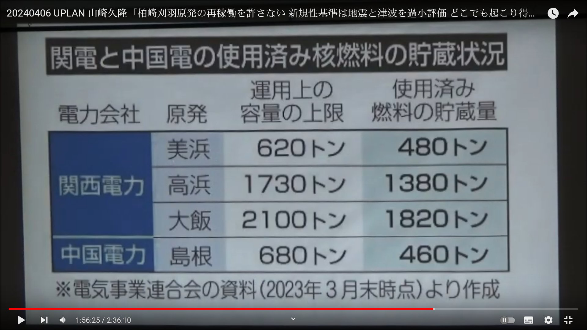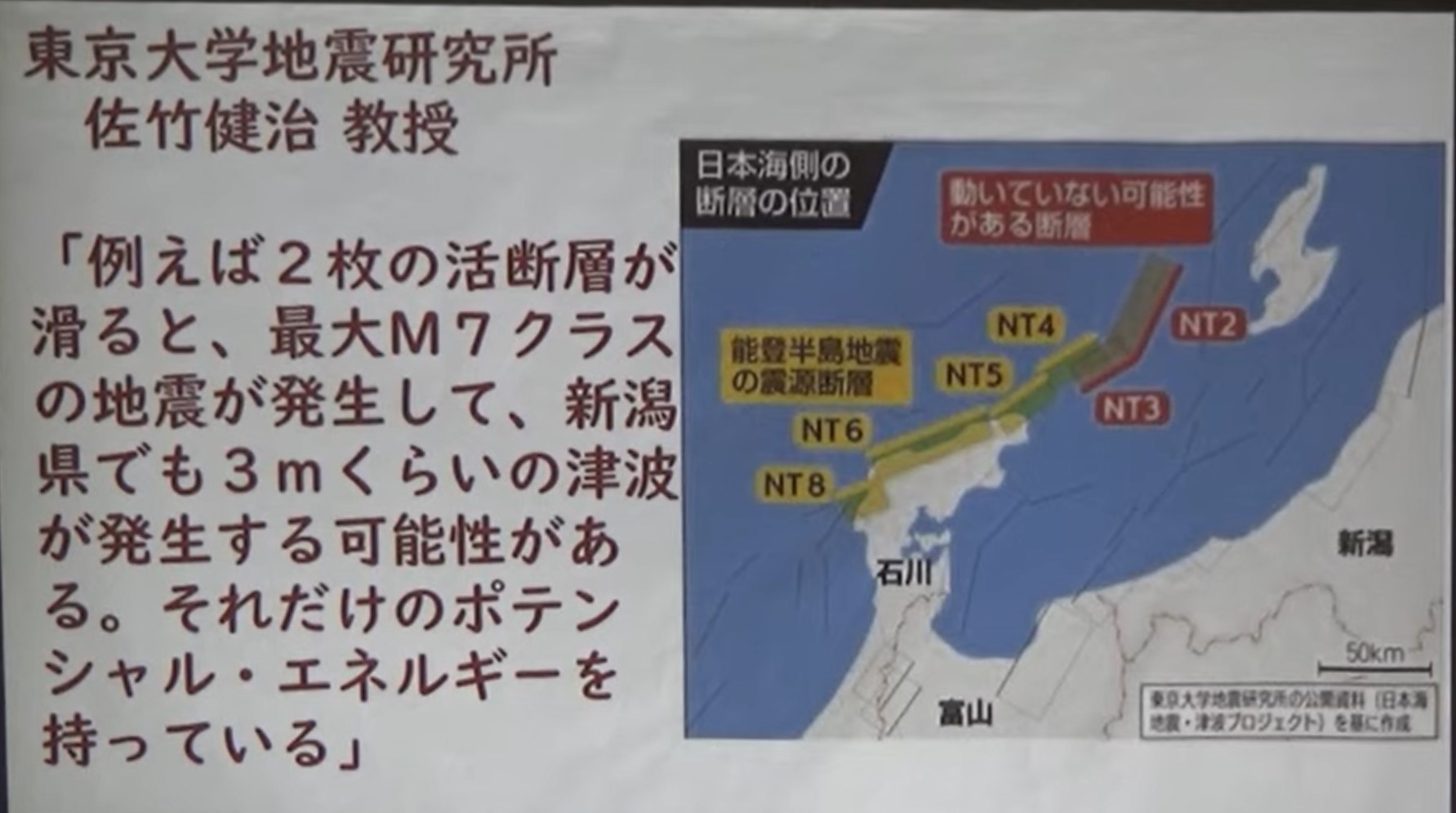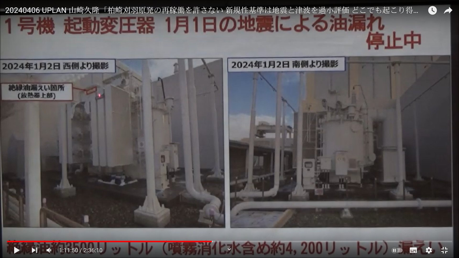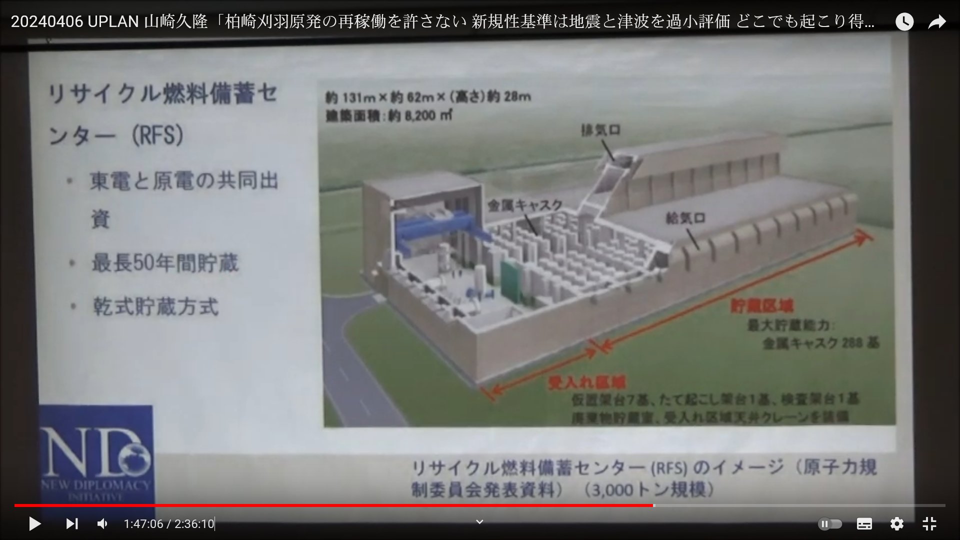 ![]() ○柏崎刈羽原発の再稼働を許さない 新規制基準は地震と津波を過小評価 どこでも起こり得る津波災害と巨大地震 [ 動画先頭:0:01:23〜 ] 今日は柏崎刈羽原発を中心にして問題点を明らかにしたいと思います。 といいますのは、柏崎刈羽原発の再稼働に向けた事前準備ということで、二つのことがこれから行われようとしています。それが非常に大きな問題を抱えているということを中心です。 その第一番目としては、再稼働のために7号機に燃料体を装荷する。これから画策をしようとしている。時系列にいうとこれが一番早い。 それから、使用済み燃料の輸送を行います。青森県のむつ市のRFS(リサイクル燃料貯蔵)という会社の貯蔵施設に送る作業を行います。 その間に挟まって、だろうと思われれる、日にちがあきらかでないこととして、ー燃料プールの輸送、 号機間輸送 と呼んでいるんですけれど。例えば4号機の燃料プールが空いたから、そこに7号機から移すみたいな。そんなことをいつ日程かわかりませんが、やろうとしているであろう。そういう作業もあると考えられています。 それらを含めまして柏崎刈羽原発の現状を説明する。そのあと、柏崎刈羽原発は能登半島地震によって新たな問題があることが浮き彫りになりました。 そのことも、その次に説明します。まあ、私たちは柏崎刈羽原発どんな理由があろうと反対なので、あまり何が起きたから、反対が変わるなんてことはありませんから、影響がないといやないんですけれど、ずっと反対なんだから。 けれども世の中的には、かなり大きな影響でして、柏崎刈羽原発が動き出して、地震や津波に遭遇した場合のリスクというのが、今まで考えられていたよりも、かなり大きい。 さらに東電の柏崎刈羽原発の想定自体はかなり怪しい。ということが本来ならばこの能登半島地震によって浮き彫りされたのですから、そのことをもって、ま、言ってみりゃ、審査のやり直しと言いますか、想定のやり直しといいますか、そういったようなことも含めて、やっていくべきこと、そういうレベルのことなんだと私は思っていますけども。 そういう動きはもちろん全くなく、規制委員会は柏崎刈羽原発に問題があるとは露ほど思って思っておらず。さらにIAEAまでやってきて、お墨付きを与えようとしている。はっきり言って、IAEAの人たちは、原発はプロかもしれませんが、地震は素人ですから、津波ももちろんド素人ですから、あの彼らの出身国で、地震や津波に遭遇して大変な目に遭ったなんてことは、ほぼない人たちなんですよね。ヨーロッパが中心なんで。アルゼンチンのウノシー事務局長ただ知らないしチリじゃないですからね。チリの出身だったらちょっと違うかもしれない。 そういうことで、結局自分たちの知見の外側にある地震と津波によって原発がとんでもないことになるよということをあまり理解していない人たちが、IAEAでやってきて、何を見ていったかというと、結局、セキュリティ上の問題点、IDカードがどうしたとか、監視カメラが壊れたとか、そういったレベルのことがちゃんとまともに直ってますかっていうそういう議論をしに来ただけなんですね。 自然災害に遭遇してどうなるかなんてことは、まあもちろん知見がないのでわかりません、誰か記者が聞いてくれればいいのですけれども。誰も聞いてくれないんで、そういうニュースにならなくて悲しいんですけど。 そういうことをしに来たわけでは全くないのに、当然のことながら、国はこのIAEAのそのうち出るであろう報告書で、お墨付けをもらったと、またやるわけですね。 汚染水の絡みで、IAEAに対して、なんか見てくれと、チェックしてくれと言って、結果的には政府が作った日本政府が作った放出のプロセスと、それから東京電力が書いた申請書、それらを読んで、それらがいわゆる国の規制だけではなくて、国際規制基準の中に合致しているかどうかという話をしたわけなんですね。要は、そのプロセスが唯一のものなのか、もっと別にいい方法がないのかとか。 あるいは放出した放射性物質が想定外のものが含まれていた場合どうなるのか、とかそういったことは一切念頭にありませんので、そういったことが念頭にない上で、IAEAがあの福島第一の汚染水の放出について評価すれば、国の評価の追認するしかないのは当たり前であります。 例えば私たちが大学の入試の試験問題を借りてきてですね。誰それさん合格したらしいんですけど、これ合ってますか?って言われてね。そりゃあってるでしょうよというしかない。どこが間違ってるんだって知見があるわけじゃないそういうレベルなんですIAEAは。彼らが一番必死になっているのは、福島第一原発事故によって世界中の原子力発電所の建設計画が全部一斉にストップした。例外は中国とロシアです。それ以外の国は全部ストップした。 それを再度復活させるのに十年以上かかった。というところで、二度とこんな事