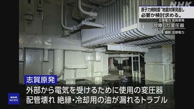 | ============================= ●能登2024-変圧器の耐震性向上が必要_ ============================= (1) 共同 2024/1/1 志賀原発の変圧器で火災発生、消火済み |