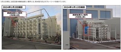 なお、1月2日にお知らせした2号機主変圧器からの 絶縁油 漏えいについては、本日、漏えいした絶縁油約19,800リットル(水分も含め約24,600リットル)の回収が完了しました。漏えい量が想定(約3,500リットル)より増えた要因は、当初、漏えい箇所より高い位置にある コンサベータ (油劣化防止装置)内の保有量のみの漏えいを想定していましたが、変圧器本体等の一部も漏えい箇所より高い位置にあり、この範囲にある絶縁油も合わせて漏えいしたことによるものです。(添付資料1)