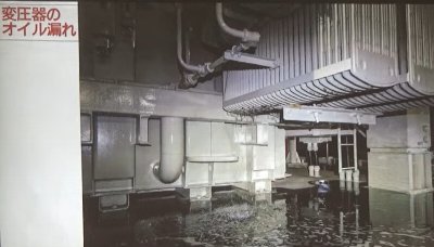 冷たい状態のままだったと思いますけれど、しかし、そこで漏れているこの 絶縁油 というのは運転中ならば高温になります。もし大きな揺れに襲われて、スパークすなわち アーク放電 のような、高い温度になる放電火災が発生したら、着火します。 |