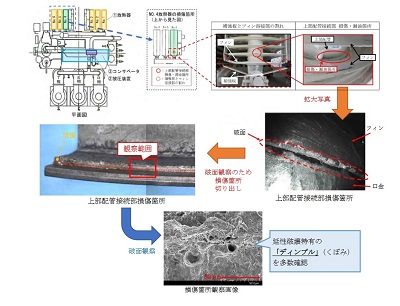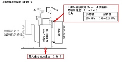 <要旨> 絶縁油の漏えいが確認されたNo.4放熱器について上部配管接続部の損傷(約 60mm)及び補強板と フィン 溶接部の割れを確認。これらについて、破面観察及び 構造解析 を実施。 損傷した原因は、 放熱器 が地震動と 共振 したため、放熱器上部配管接続部に対して設計時に考慮した 静的水平加速度 0.5G を上回る加速度が発生し、部材に許容値を超える過大な応力が発生したことによるものと推定。 <破面観察結果> No.4放熱器上部配管接続部及び補強板において、主に「 延性破壊 (※1)」を確認。 (延性のある金属材料が過大な荷重を受けた時に発生する ディンプル と呼ばれるくぼみを多数確認。) ![]() ※1 「延性破壊」:材料に引張力を加えた時に大きな塑性変形を起こし、最終破断までに材料の著しい伸びや絞りを伴う破壊現象。 1.志賀1号機起動変圧器からの絶縁油漏えい(つづき) <構造解析結果> (1)固有値解析 ・変圧器本体(タンク部)が 剛構造 であることを確認 ・放熱器が共振しやすい構造であることを確認 (2)動的解析 ・損傷箇所に静的水平加速度0.5Gを上回る加速度が発生したことを確認 ・損傷箇所に許容値を上回る応力が発生したことを確認 ![]() 1.志賀1号機起動変圧器からの絶縁油漏えい(つづき) <事象進展メカニズム> @ 地震発生に伴い、放熱器が共振 A フィン−補強板溶接部の応力が許容値を超過し破断 B No.4放熱器の補強板−補強板溶接部にき裂が進展し破断 C No.4放熱器の補強板が破断することにより放熱器の揺れが増大 D No.4放熱器の上部配管接続部の応力が許容値を超過し損傷 2.志賀2号機 主変圧器 からの絶縁油漏えい <破面観察結果> 上部配管接続部において、主に低サイクルの「 疲労破壊 (※2)」を確認。 ( 低サイクルの疲労破壊 時に発生する亀裂進展幅の大きいストライエーション状の模様を確認。 ![]() ※2「疲労破壊」:材料に繰返し応力がかかることで、表面または内部の欠陥や割れなどを起点として小さい割れが徐々に進行し、最終的に構造物が破壊する現象。 3.地震対策 今回損傷した変圧器について補修等を行う。 また、地震発生に伴い、変圧器の一部部品に共振が発生したことが原因であることから、更なる信頼性向上のため、共振を抑制する等により、今回の地震動を踏まえた地震対策をすすめる。 |