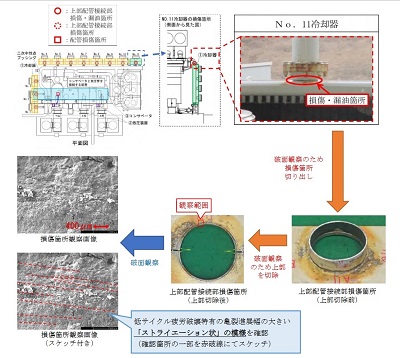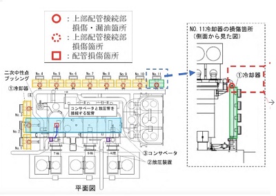 1月1日に起きた能登半島地震では、1号機で3600リットル、2号機で2万4600リットルもの絶縁油が漏洩した。既報時点では、揺れで「亀裂が入った」ところまでしか分からなかった。今回はより詳しく、地震動との共振により、1号機の 起動変圧器 では「延性破壊」が、2号機 主変圧器 では「疲労破壊」が起きたと分かった。 Q:(延性破壊とは)伸びちゃって変形したということですね。 北陸電力広報:そうです。 2号機の方は、配管接続部で 低サイクルの「疲労破壊」 を確認したと書いてある。そこで尋ねた。 「疲労破壊」は経年劣化と同じ事象? Q:低サイクルによる疲労破壊というのは、いわゆる「 経年劣化6事象 」の一つとされる、繰り返し応力がかかって起きるのと同じですね? 北陸電力広報:そうですね。経年劣化ではないが、小さな揺れが何回も繰り返し起きたことで、今回、疲労破壊が起きた。 Q:すると、今回、全体が揺れたので、この部分だけではなくて、同じように金属疲労、細かい振動を受けたところで同じような繰り返し応力が起きて、疲労破壊が起きたとか起きそうになっているところがあると考えられるんですが。 北陸電力広報:ご指摘の通りで、平面図のNo.11のところが損傷して漏洩したが、その他の 放熱器 、黄色で枠を囲ったNo.1〜10まで赤の点線のすべての冷却機の配管の接続部が損傷した。ただ漏油した箇所はNo.11だった。