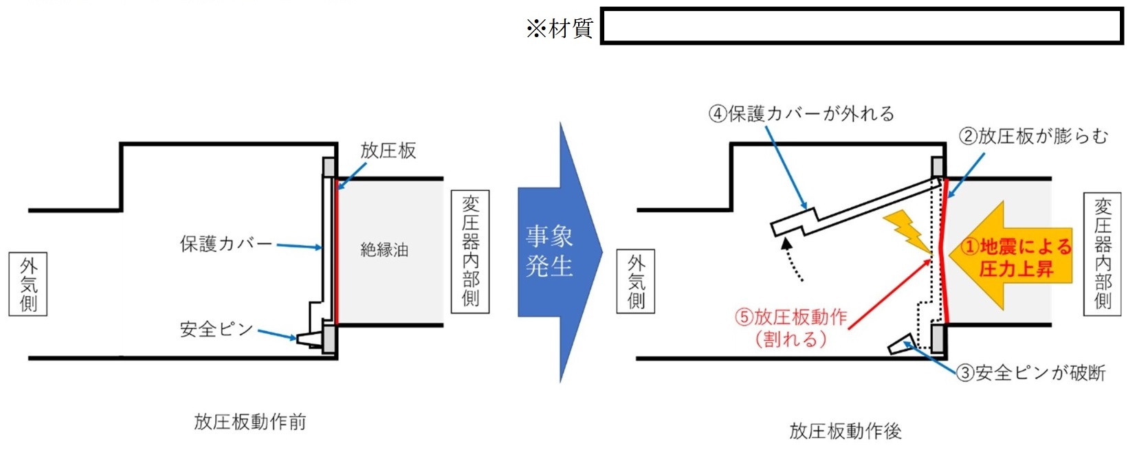 [08]放圧板とは? 放圧板※は、変圧器の内部短絡事故による発生ガスなどでタンク内の圧力が規定圧力以上に上昇した ときに、ガスを排出することで事故の拡大を防止する目的の装置である。 また、放圧板はその仕組み上、地震により 250〜□ gal 程度の加速度が加わった場合に油の衝撃圧 の影響で動作する可能性がある。具体的な動作原理は、変圧器内は絶縁油で満たされているため、地震 の揺れが絶縁油の運動エネルギー(衝撃圧)となり、放圧板に圧力がかかることにより、放圧板が膨ら み保護カバーを押し上げる。その後、保護カバーを押し上げる力が一定程度を超過すると、安全ピンが 破断することで保護カバーが開き、放圧板がさらに膨らみ、放圧板が割れる状況に至る。(図1参照) 今回の地震(1号機原子炉建屋地下2階 399.3gal(合成方向))により、上記状況に至り、放圧板の 動作に至ったと推定している。