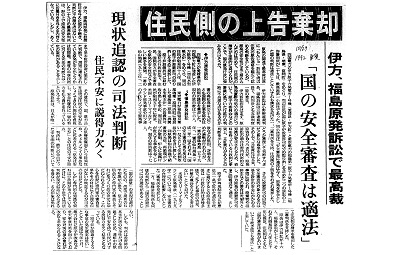 | 住民側の上告棄却 伊方、福島原発訴訟で最高裁 「国の安全審査は適法」 | 東奥日報 | 1992/10/29 |