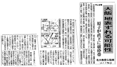 | 大飯 地表ずれる可能性 原子炉直下に破砕帯 名大教授ら指摘 | 中日新聞 | 2012/06/07 |