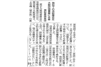 | 大飯の揺れ算定法「不十分」 地震調査委 規制委の認識疑問視 | 東京新聞 | 2018/01/30 |