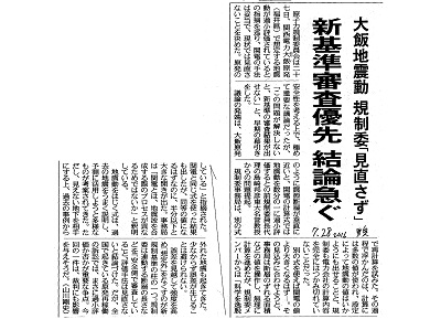 | 大飯地震動規制委「見直さず」 新基準審査優先 結論急ぐ | 東奥日報 | 2016/07/28 |