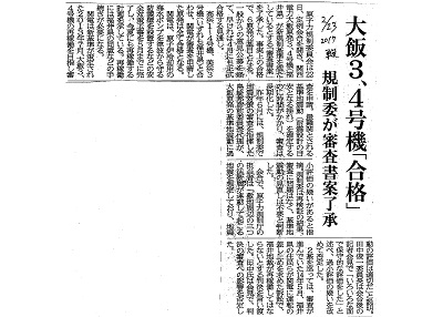 | 大飯3、4号機「合格」 規制委が、審査書案了承 | 東奥日報 | 2017/02/23 |