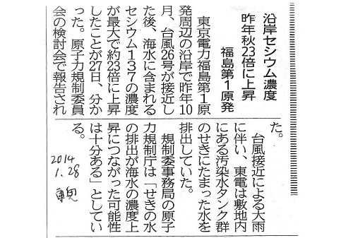 | 沿岸セシウム濃度 昨年秋23倍に上昇 福島第1原発 | 東奥日報 | 2014/01/28 |