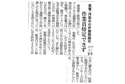 | 東電・汚染水の弁開閉操作 作業員特定できず | 東奥日報 | 2014/03/01 |