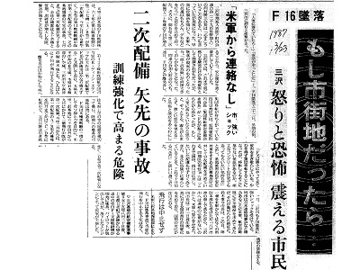 | 三沢基地F16墜落 原因はエンジン不調 市長、飛行中止を要請 米軍謝罪、だが訓練は続行 | 東奥日報 | 1987/03/24 |