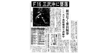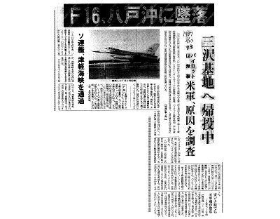 | F16、八戸沖に墜落 三沢基地へ帰投中 パイロットは無事 米軍、原因を調査 | 東奥日報 | 1987/03/23 |
