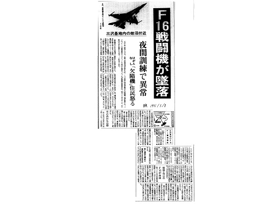 | F16戦闘機が墜落 三沢基地内の姉沼付近 夜間訓練で異常 けが人なし 「欠陥機」住民怒る | 東奥日報 | 1991/05/08 |