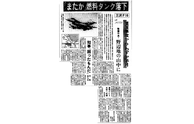 | 「またか」燃料タンク落下 三沢F16 墜落事故から わずか半月 整備不良? 野辺地の山中に | 東奥日報 | 1991/05/24 |