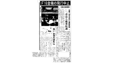 三沢基地進入表面下町内会連合会(2900世帯)の河村勝三会長は「必ずこういうことがあると、いつも言っていたが現実になった。早急に役員会を開いて、米軍への抗議はもちろん、デモなどを行う」と怒りを込めて語った。さらに、間もなく第二次配備で二十数機のF16が増えることから、安全確保を強く要求していく−とした。(中略)F16は米極東戦略の一環として対ソ抑止力を目的に、米軍三沢基地に60(1985)年4月から9月にかけて一個飛行中隊が第一次配備。今年2月からは、第一次配備のA/B型の機種を4月までかけてC/D型に転換中で、5月以降は引続きC/D型で第二次配備となる。