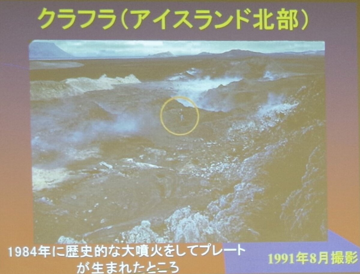 【島村】プレートというのは非常に硬いものでして、プレートが生まれるところはどこか。アイスランドでプレートが生まれます。これ(スライド)は1991年8月に私が撮った写真で、1984年にプレート生まれる大事件がありました。ここはプレートの境です。7年たっても水蒸気も出ています。プレートは海で生まれる場合が多く、陸上生まれるケースは世界に幾つもありません。ここを境にして、東側がユーラシアプレート、西側が北アメリカプレートです。ここから1万kmいった所の日本にも、この境はあります。