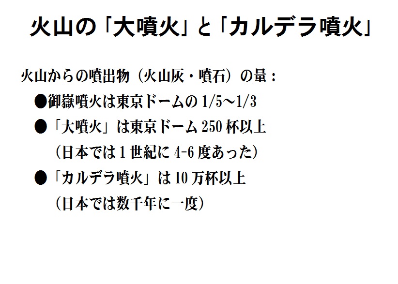 【島村】さきほど申し上げましたが、御岳の噴火はそれほど大きくなかった。それより大きい「大噴火」があります。そして、それよりさらに大きな「カルデラ噴火」というのがあります。