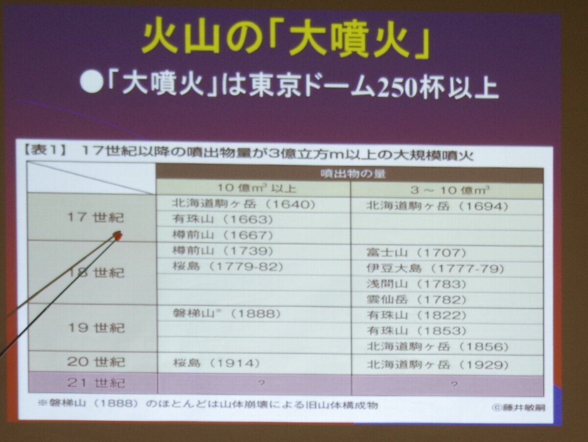【島村】これが火山の「大噴火」というものなのですが、さきほどのように、東京ドーム250杯以上ですので、10億立方m、あるいは3〜10億立方m、、両方とも250杯以上になります。17世紀には4回、18世紀には6回、19世紀には4回ありました。非常に不思議な事に、20世紀に入ると、桜島、北海道駒ヶ岳の二つだけで終わってしまいます。この最後の北海道駒ヶ岳の噴火(1929)から100年近く、「大噴火」が無いことが非常に不思議です。そういった意味では、いつかは、いつかというのは、近々なんですが、あるのではないのかというのが、地球物理学者の考えです。21世紀、このまま「大噴火」が無い状態が続くことはないというのが、地球物理学者の常識です。