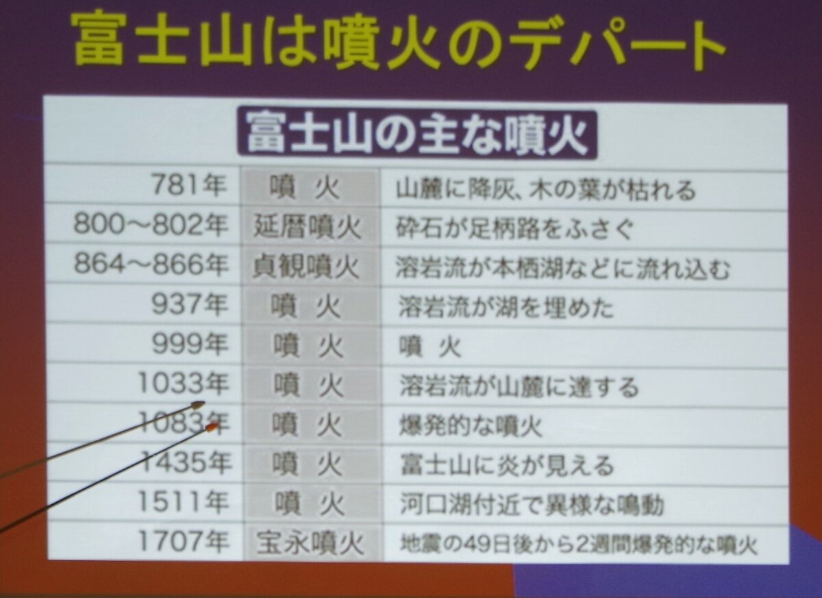 【島村】富士山の主な噴火は分かっているのはこれだけで、これは大きな噴火だけですが、小さなのはもっとたくさんあります。富士山というのはしばしば噴火する。ただ、宝永噴火から300年近く噴火はありませんから、そういった意味で、ずっと噴火しないことはありえませんので、そういった意味では、噴火しても不思議ではない。遠い将来、未来に、噴火がくるのはほぼ間違いない。