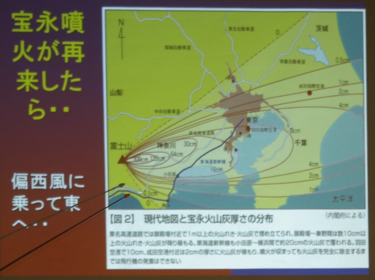 【島村】宝永火山の火山灰というのは、偏西風という西風にのって、東側へ向かった。この辺で70cm、60cmセンチ、1m、この辺でも10cm近くとなっている。火山灰が仮に首都圏まで来た場合には、例えば道路の白線が消えてしまう等の交通の大混乱が発生する恐れがある。健康被害も大変なことになる。肺の弱い方、病気気味の方は大変な影響がある。富士山は首都圏に非常に近いにも関わらず、首都圏の人は富士山の噴火を忘れていることが多い。