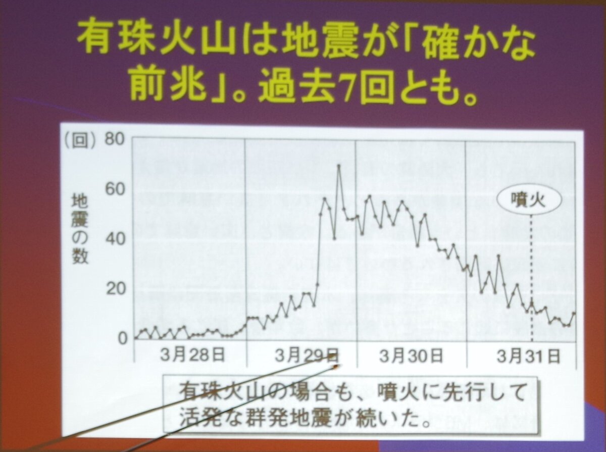 【島村】具体的には、3月31日は噴火したのですが、29日から地震が急激に増えました。あとで減ったのですが、普段よりはかなり地震回数が多いときに噴火した。ここからここ(噴火)まで、48時間、丸二日、噴火に先行して、活発な群発地震が続いた。
