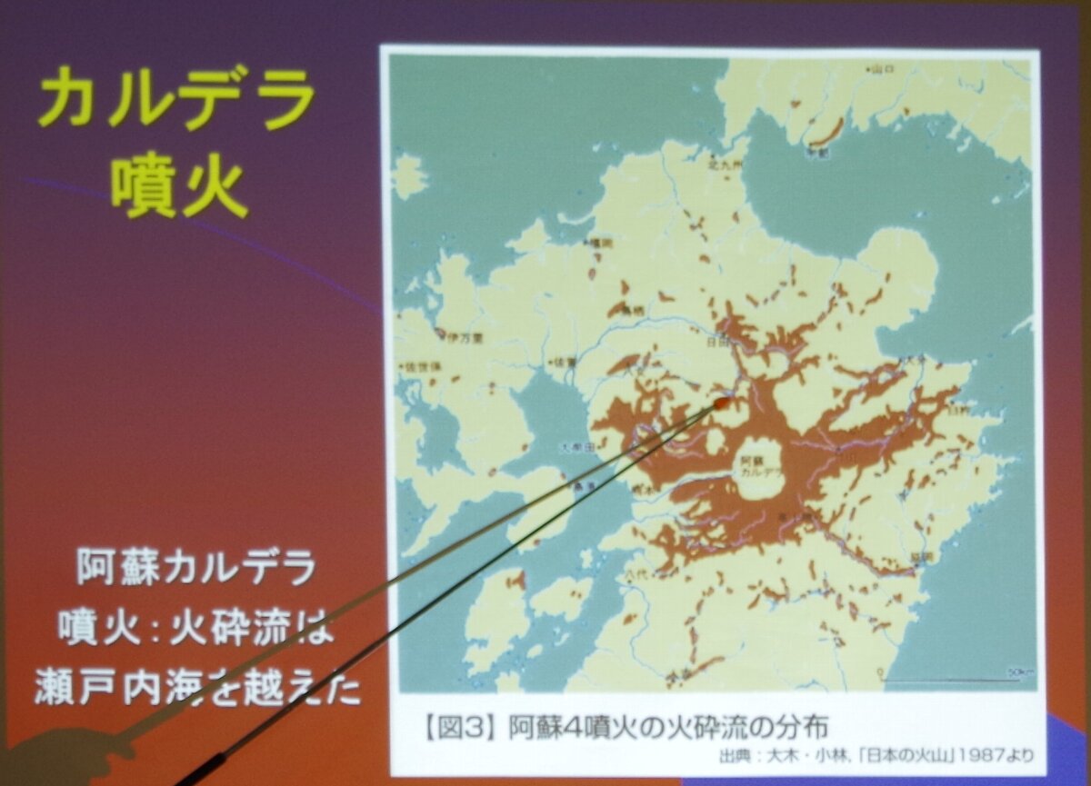 【島村】これは阿蘇山の「カルデラ噴火」です。阿蘇山は過去4回のカルデラ噴火をしています。九州全体に火山灰を降らした。九州全体に非常にもろいシラス台地を形成した。図の茶色の部分は阿蘇カルデラからでた火砕流の分布です。4回の噴火で一番最新のものです。火砕流というのは、火山ガスとか水蒸気とかで構成されるため非常に軽い。従って火砕流は海も簡単に超えてしまいます。中国地方にも阿蘇からの火砕流がきているのがわかります。