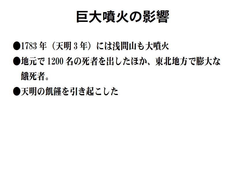 【島村】日本にかえりますと、1783年(天明3年)には浅間山も大噴火しました。丁度ラキの噴火と同じ年の噴火ですので、ラキの影響もあるかもしれません。浅間山の地元で1200名の死者を出したほか、東北地方で膨大な餓死者を出しました。天明の飢饉を引き起こしました。