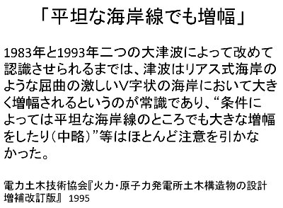 1983年と1933年二つの大津波によって改めて認識させられるまでは、津波はリアス式海岸のような屈曲の激しいV字状の海岸において大きく増幅されるというのが常識であり、"条件によっては平坦な海岸線のところでも大きな増幅をしたり(中略)"等はほとんど注意を引かなかった。