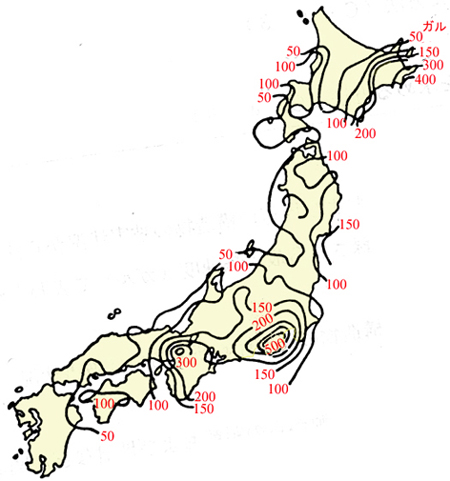 これは1951年に作成された「河角マップ」と呼ばれているもので,1350年間の被害地震345についての各地の推定震度から,標準地盤での最大加速度の75年期待値を求めて,その分布を示したものです.その後,多くの同種マップが作成されています.この種の図では,最近発生した大きな地震の影響を大きく受け,その地域が過大に評価される可能性があります.