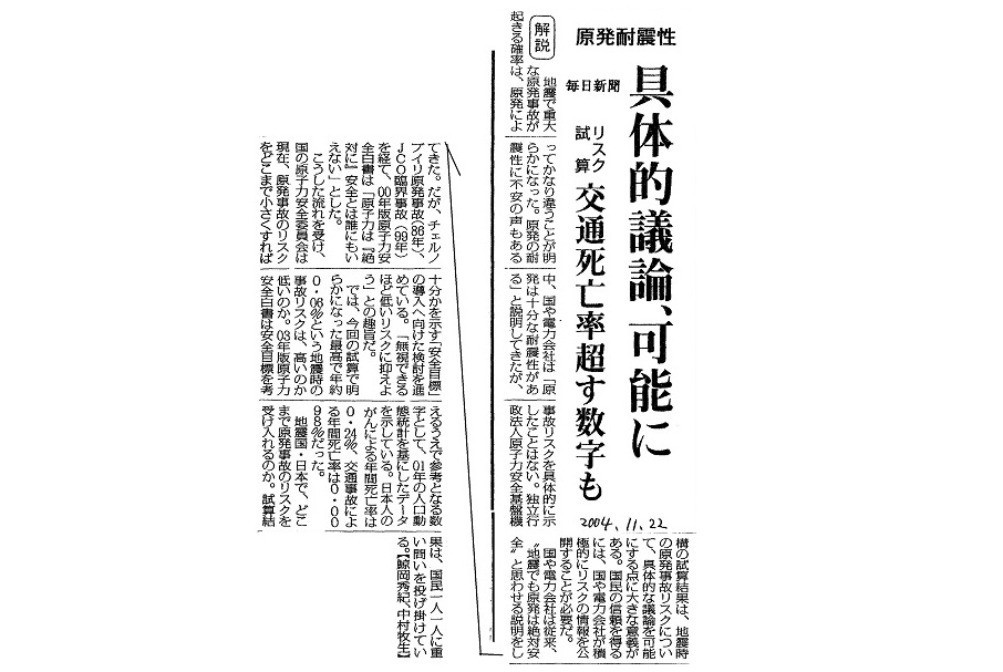| 原発耐震性 具体的議論、可能に リスク試算 交通死亡事故超す数字も | 毎日新聞 | 2004/11/22 |