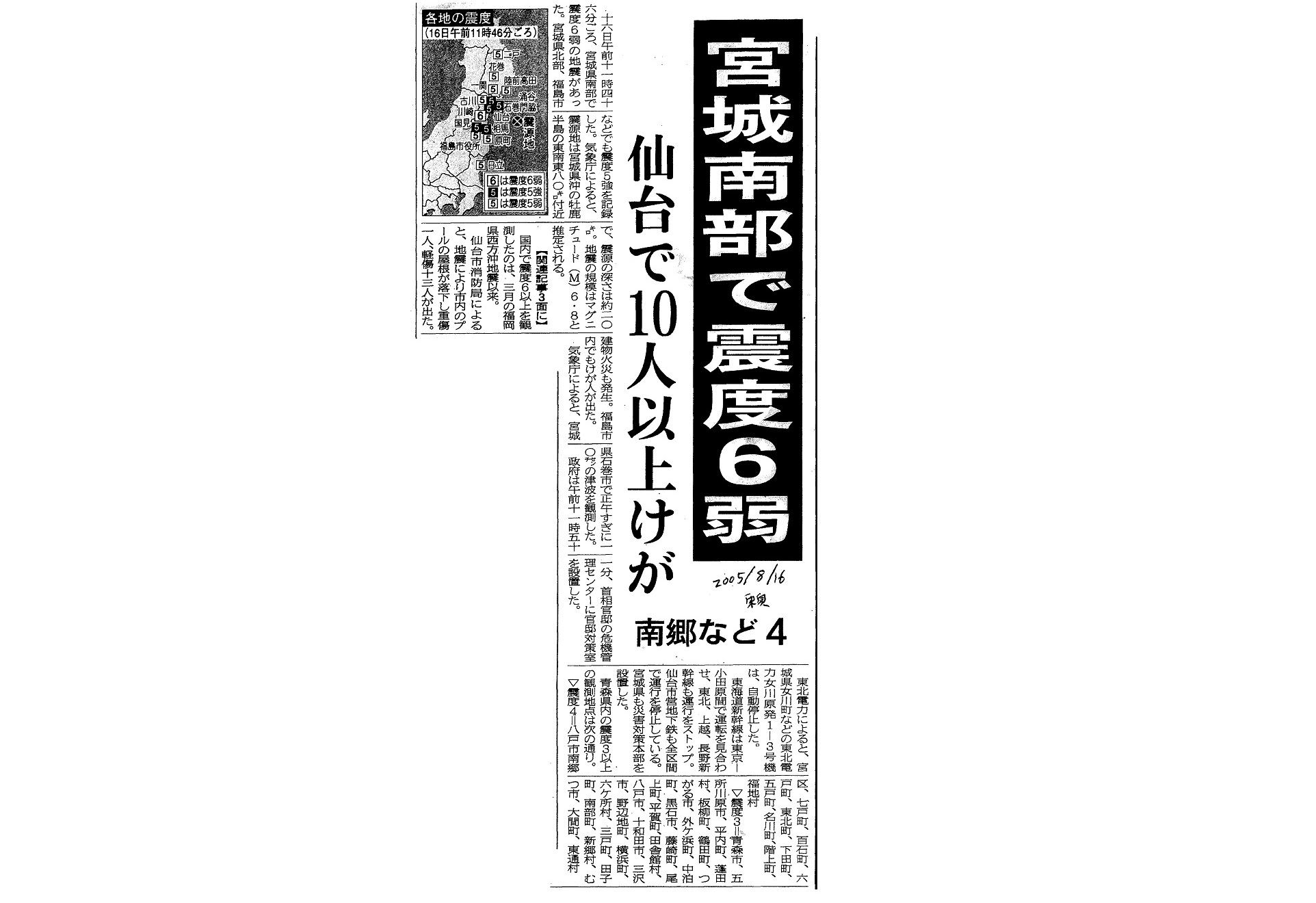 | 宮城南部で震度6弱 仙台で10人以上けが 南郷など4 | 東奥日報 | 2005/08/16 |