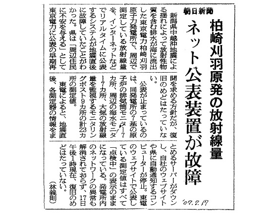 | 柏崎刈羽原発の放射線量 ネット公表装置が故障 | 朝日新聞 | 2007/07/17 |