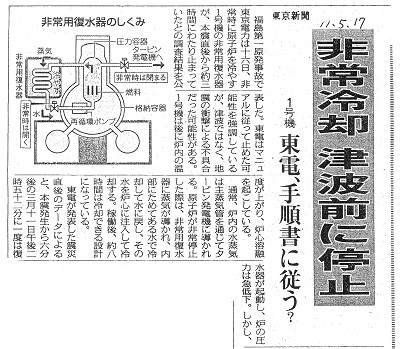 | 非常冷却 津波前に停止 1号機 東電、手順書に従う? | 東京新聞 | 2011/05/17 |
