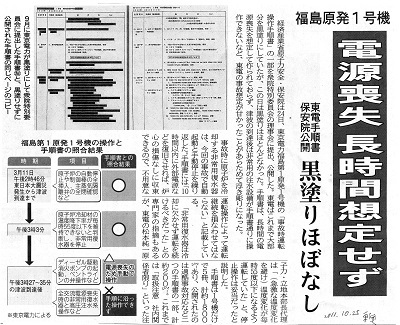 | 福島原発1号機 電源喪失 長時間想定せず 東電手順書 保安院公開 | 東奥日報 | 2011/10/25 |