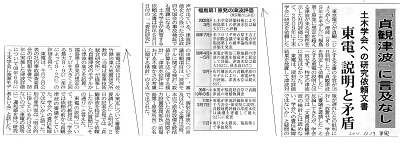 | 「貞観津波」に言及なし 土木学会への研究依頼文書 東電、説明と矛盾 | 東奥日報 | 2011/12/19 |