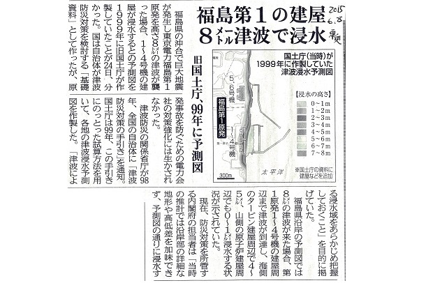 | 福島第1の建屋 8メートル津波で浸水 旧国土庁、99年に予測図 | 東奥日報 | 2015/06/25 |