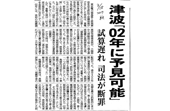 | 津波「02年に予見可能」 試算遅れ 司法が断罪 賠償費膨張 経営に影響も 東電 | 東奥日報 | 2017/03/18 |