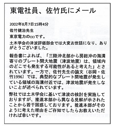 (12) 裁判のポイント (17) 高い津波は想定されていた (25) 北海道南西沖地震で再評価動き出す (36) 東電社員「40分抵抗」 (38) 東電社員、佐竹氏にメール (46) 津波は全電源喪失を起こす (53) 福島沖で「揺れ」は想定した (58) 予測されていた15.7mの津波 (60) 土木学会で時間稼ぎ (64) 津波堆積物が見つかり始めた (77) 津波を東北電力やJNESは安全審査に不可欠 (81) 「クビになるよ」「余計なこと言うな」小林調書 (88) 事故調は報告書を隠した (109) まだ隠していること 2011年〜 |