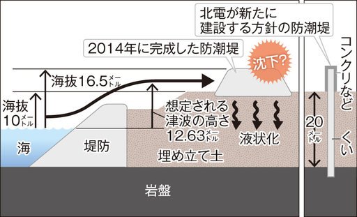 | 地震で液状化、防潮堤沈下の恐れ北海道電力は、泊原発(後志管内泊村)が強い地震に襲われた場合に敷地が液状化し、津波の防潮堤が沈下する恐れがあることへの対策として、固い岩盤にくい打ちした防潮堤を新たに建設する方針を固め、原子力規制委員会に伝えた。(後略) |