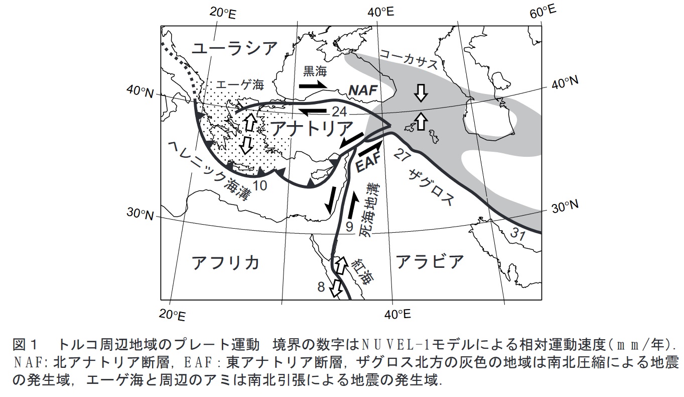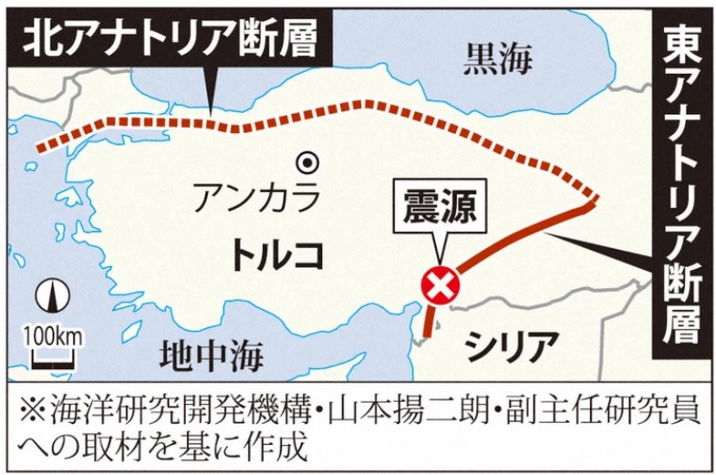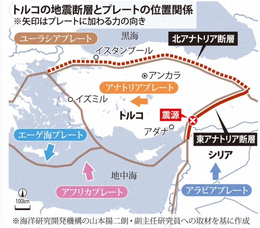トルコはユーラシアプレートやアラビアプレートなど四つのプレート(岩板)が複雑にひしめき合う地域にある。これらの合間に、トルコ本土が乗るアナトリアプレートという比較的小さなプレートが挟まれ、東側から左回りにエーゲ海へ押し出されるような力が加わっている。米地質調査所によると今回の地震はマグニチュード(M)7・8で、震源はプレート境界にある「東アナトリア断層」付近。長さ100キロ、幅50キロにわたり断層が動いていた。