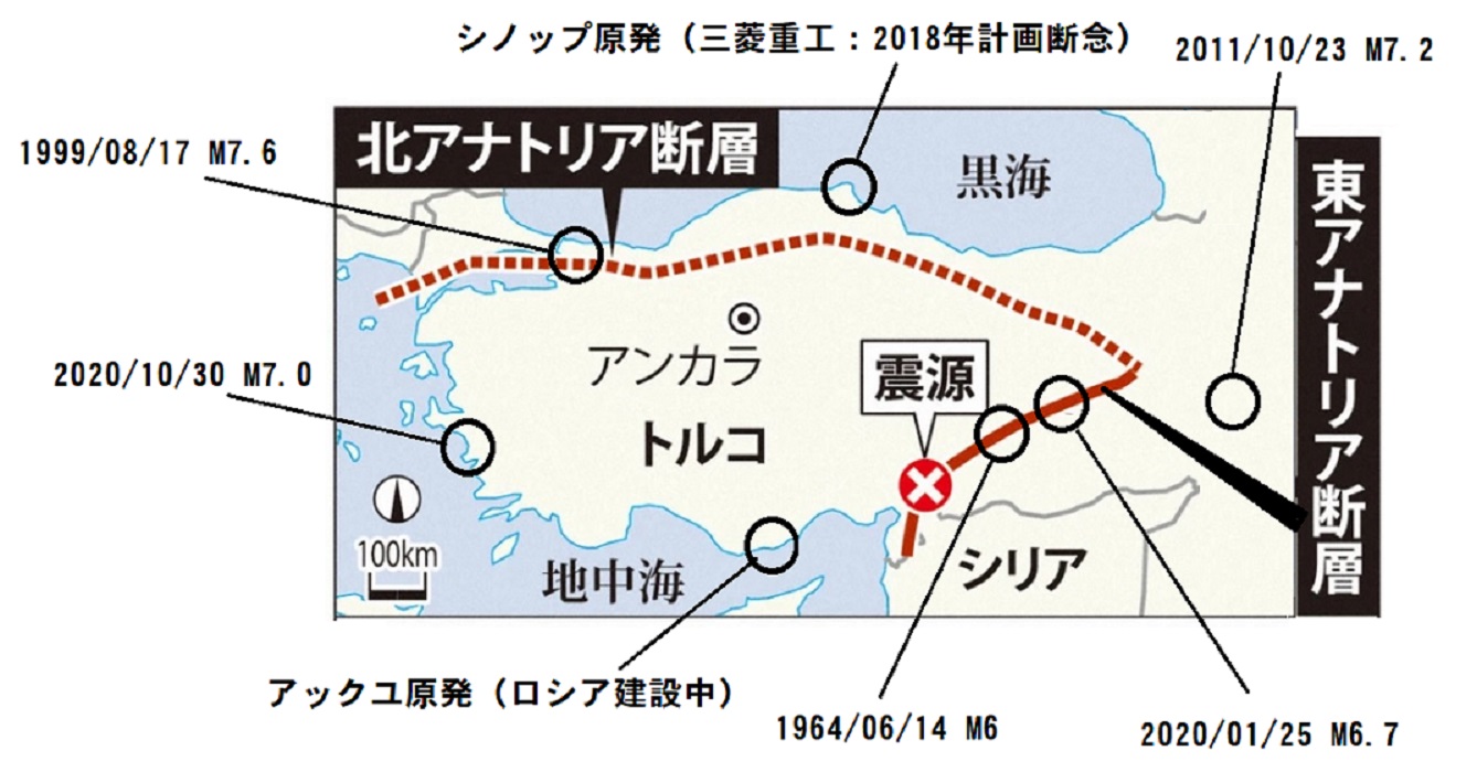 トルコでは東日本大震災以降にも、安倍内閣(経産省内閣とも言われる)と三菱重工が原発の売り込みを行っていました。黒海側のシノップ原発です。結局は計画断念となりましたが、計画通りであれば、今回の地震の年(2023年)に運転開始となっていました。心の底から、計画断念となってよかったと思います。 一方、ロシアは地中海側のアックユに原発を建設中で、核燃料はまだ装荷していないとのことです。今回の地震で被害が無かったのは、ただ運がよかったにすぎないと思います。 大事故を経験したはずの二つの国が、地震が頻繁に起きると分かっているトルコに原発を作ろうとする。黒海、地中海が事故により汚染されたら、未来永劫、日本、ロシアは非難されることでしょう。 そして、日本では、自らの国の事故により、原発の価格が高騰したため、原発の海外展開が難しい状況になったことにより、今度は、国内にということで、60年超運転、原発建て替え、次世代原発検討等を打ち出して来ました。これは福島原発メルトダウン事故を経験した私にも、とても許しがたいことです。 以下に、今回の地震と、トルコで起きた地震、トルコの原発等々の記事をまとめましたので、トルコの地震と原発について、理解が深まれば幸いです。 項目は以下の通りです。クリックすると該当項目の先頭に移動します。 ●1964/06/14 トルコ東部でM6の地震発生(死者8人) ●1999/08/17 トルコ北西部でM7.6の地震発生(死者1万7千人) ●2011/10/23 トルコ東部でM7.2の地震発生(死者600人) ●トルコで三菱重工のシノップ原発輸出計画 2018年12月に断念 ●トルコでロシアが建設中のアックユ原発 地震(2023年)被害は無かった模様 ●2020/01/25 トルコ東部でM6.7の地震発生(死者36人) ●2020/10/30 トルコ西部でM7.0の地震発生(死者116人) ●2023/02/06 トルコ・シリア地震発生(M7.8、死者5万人超) |