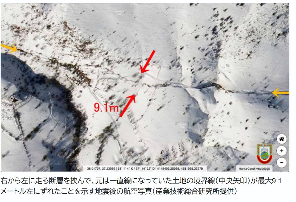 マグニチュード(M)7.8〜7.5だったトルコ・シリア大地震では活断層によって地表が最大約9.1メートルずれたことが、産業技術総合研究所(茨城県)による25日までの分析で判明した。地震後に撮影した航空写真を分析した。日本の観測史上最大の内陸地震で、1891年に岐阜県などを襲った濃尾地震(M8.0)の約8メートルを超える。近藤久雄主任研究員(古地震学)は「内陸の地震で水平方向のずれとしては世界最大級だろう」としている。