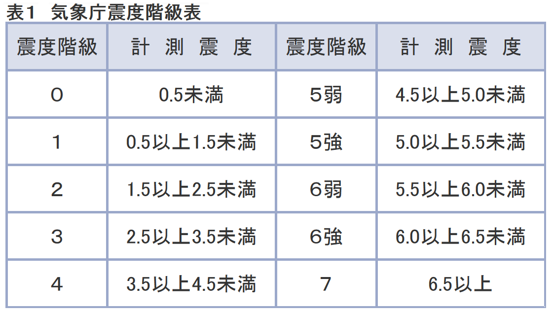 (図表01) 気象庁震度階級表 (図表02) 震度とゆれの状況 (図表03) 気象庁震度階級関連解説表 (図表04) 気象庁震度階変遷表(1)明治17年〜昭和24年まで(1/2) (図表05) 気象庁震度階変遷表(1)明治17年〜昭和24年まで(2/2) (図表06) 気象庁震度階級関連解説表と旧震度階との比較(人体感覚) (図表07) 気象庁震度階級関連解説表と旧震度階との比較(建物被害) (図表08) 震度とマグニチュード |