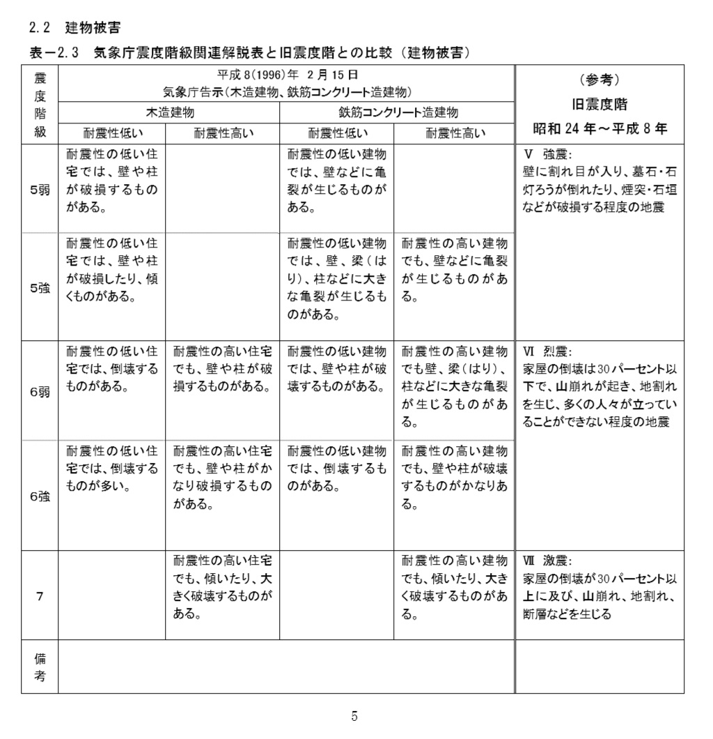 (図表07) 気象庁震度階級関連解説表と旧震度階との比較(建物被害) (参照元) 地震時における建物被害の表現が、旧震度階と現在の震度階でどう変化しているかを示す